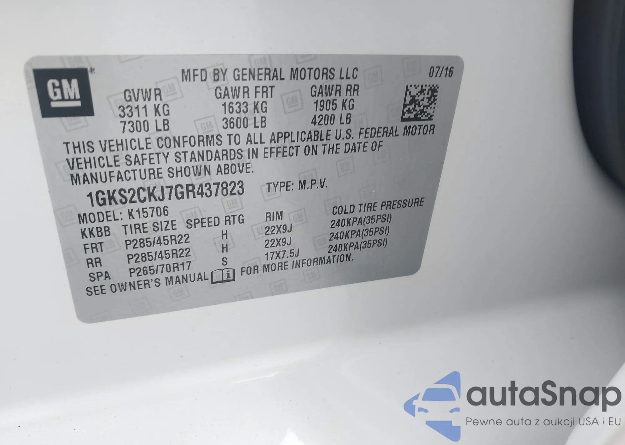 LOT: 43766861 VIN: 1GKS2CKJ7GR437823