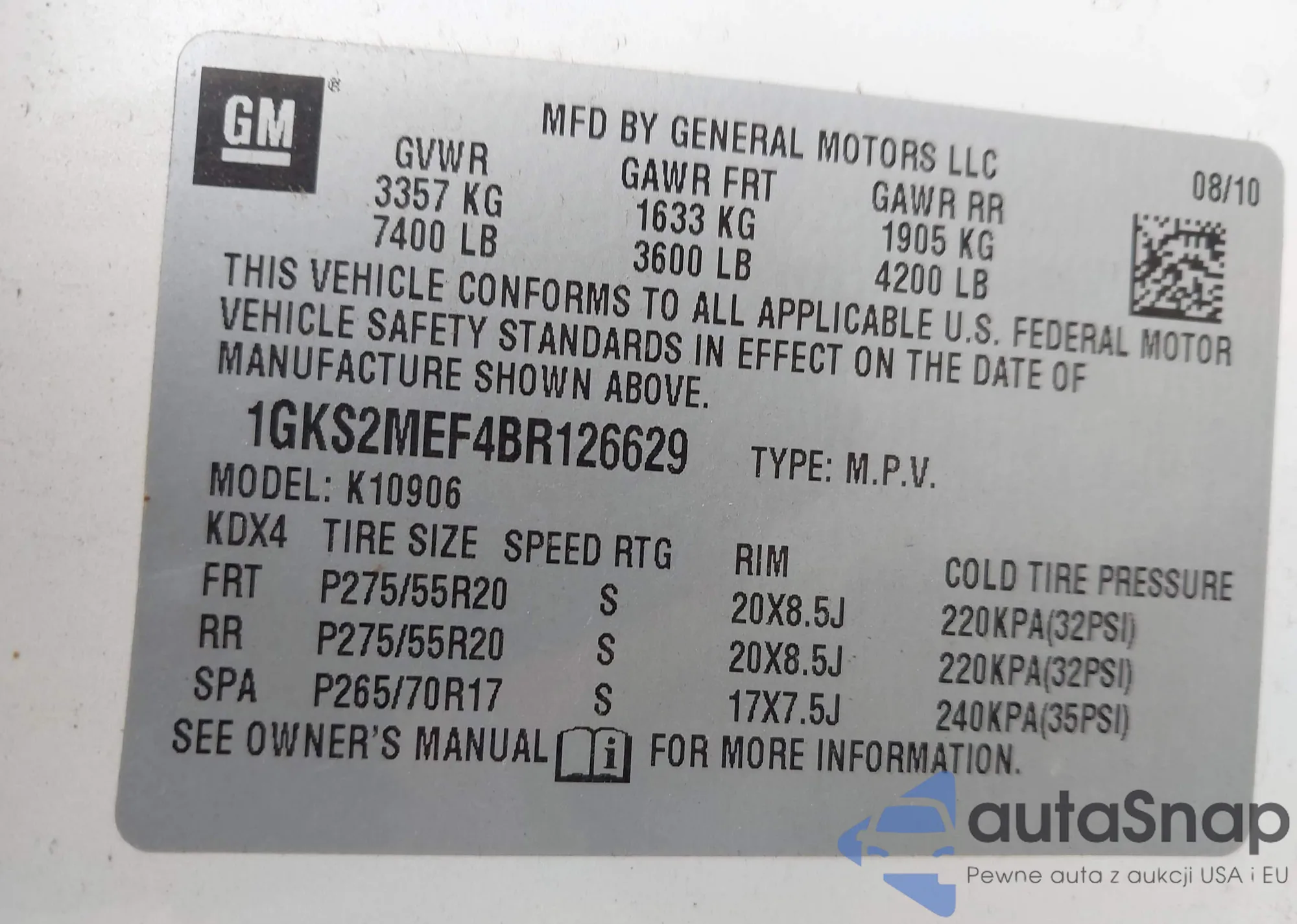 LOT: 43359136 VIN: 1GKS2MEF4BR126629