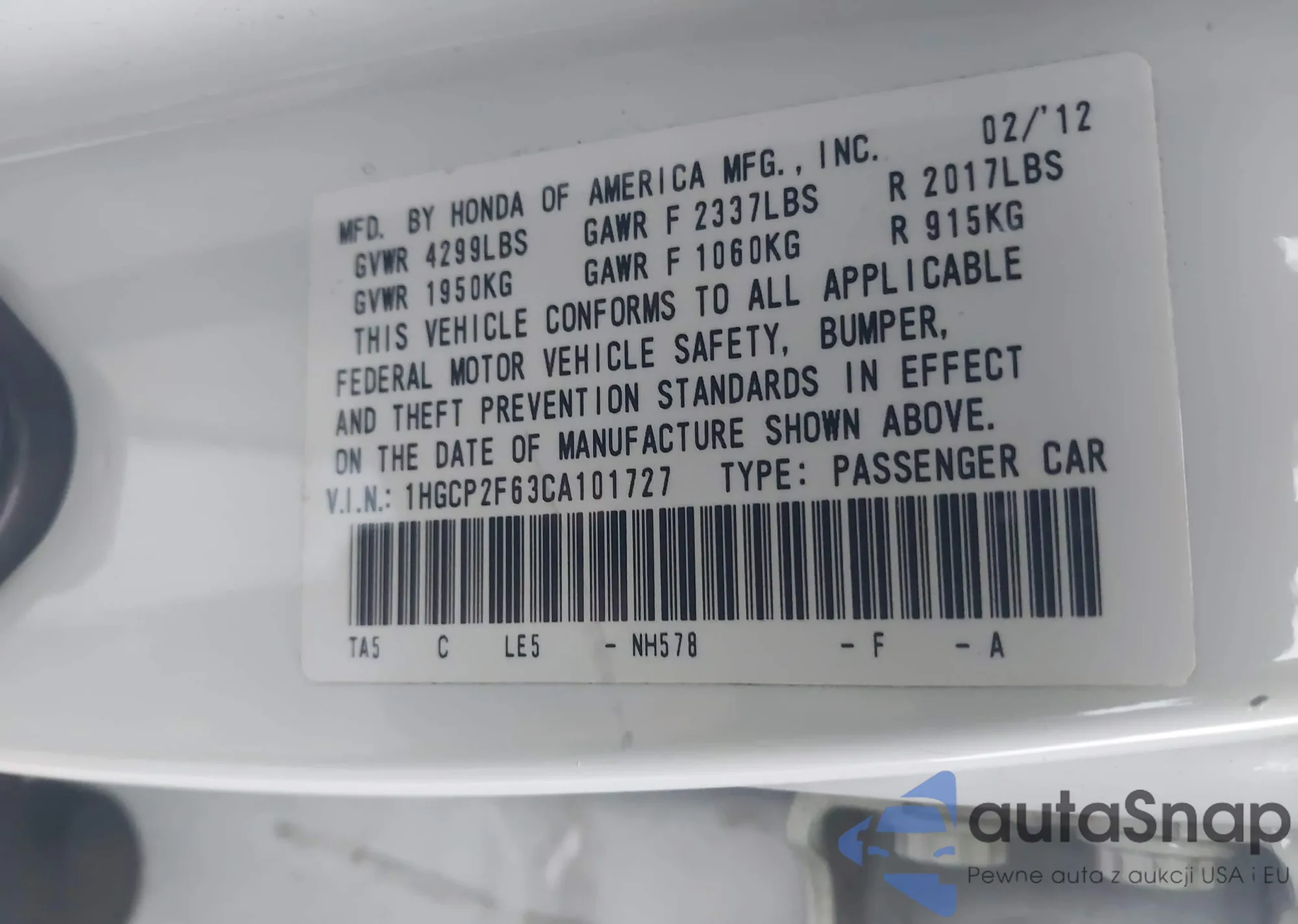 LOT: 44131730 VIN: 1HGCP2F63CA101727