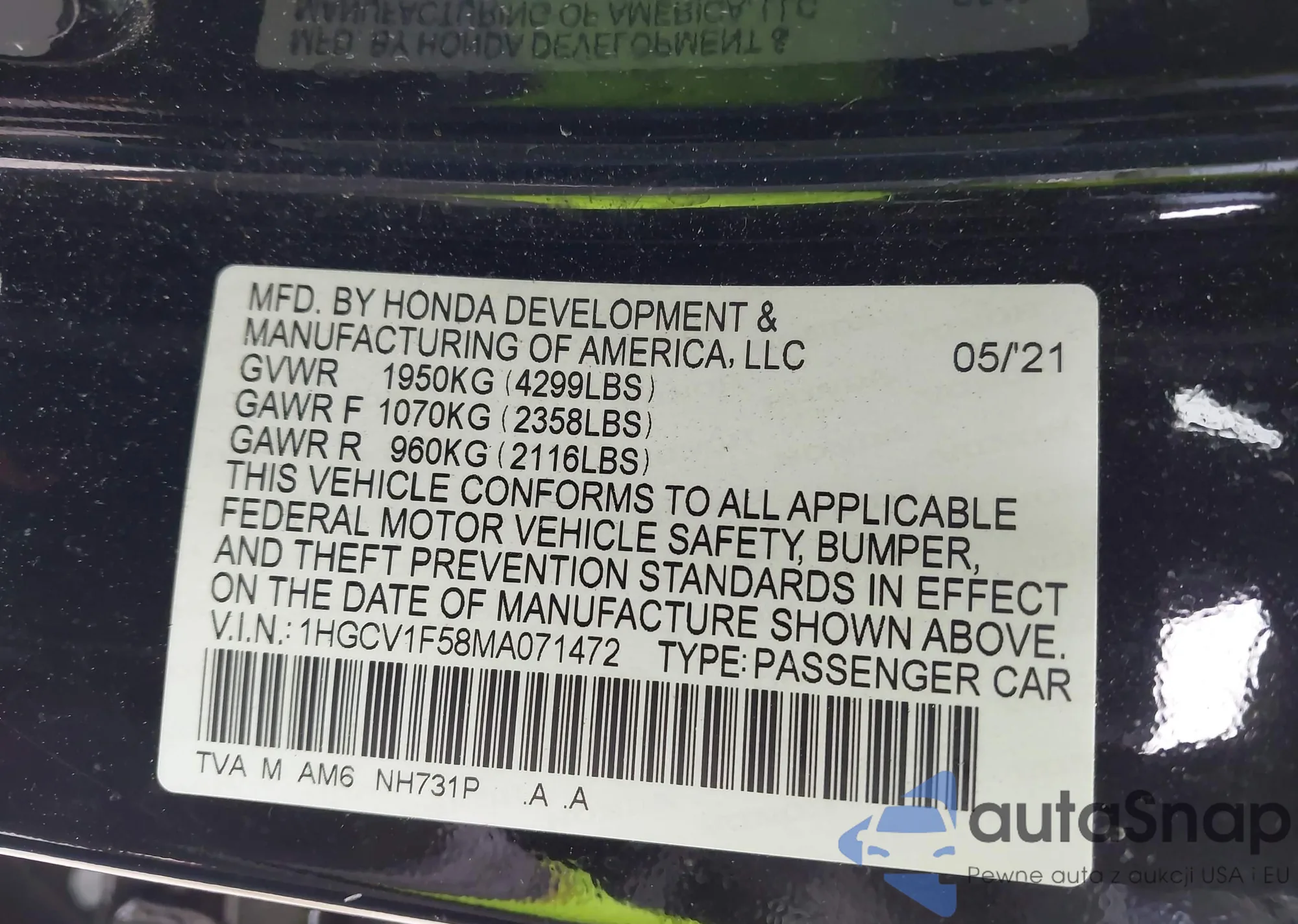 LOT: 43928632 VIN: 1HGCV1F30MA105340