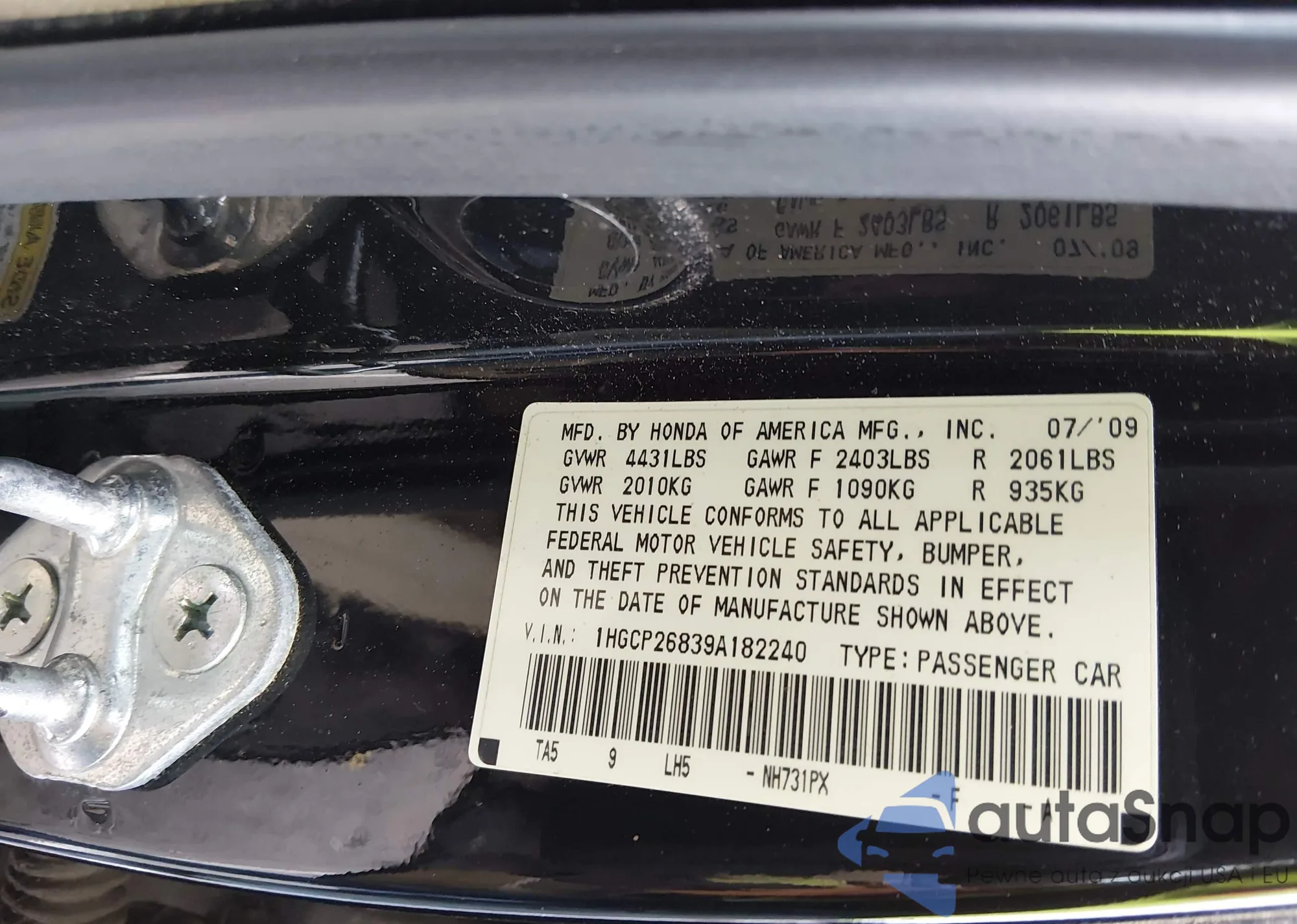 • VIN 1HGCP26839A182240