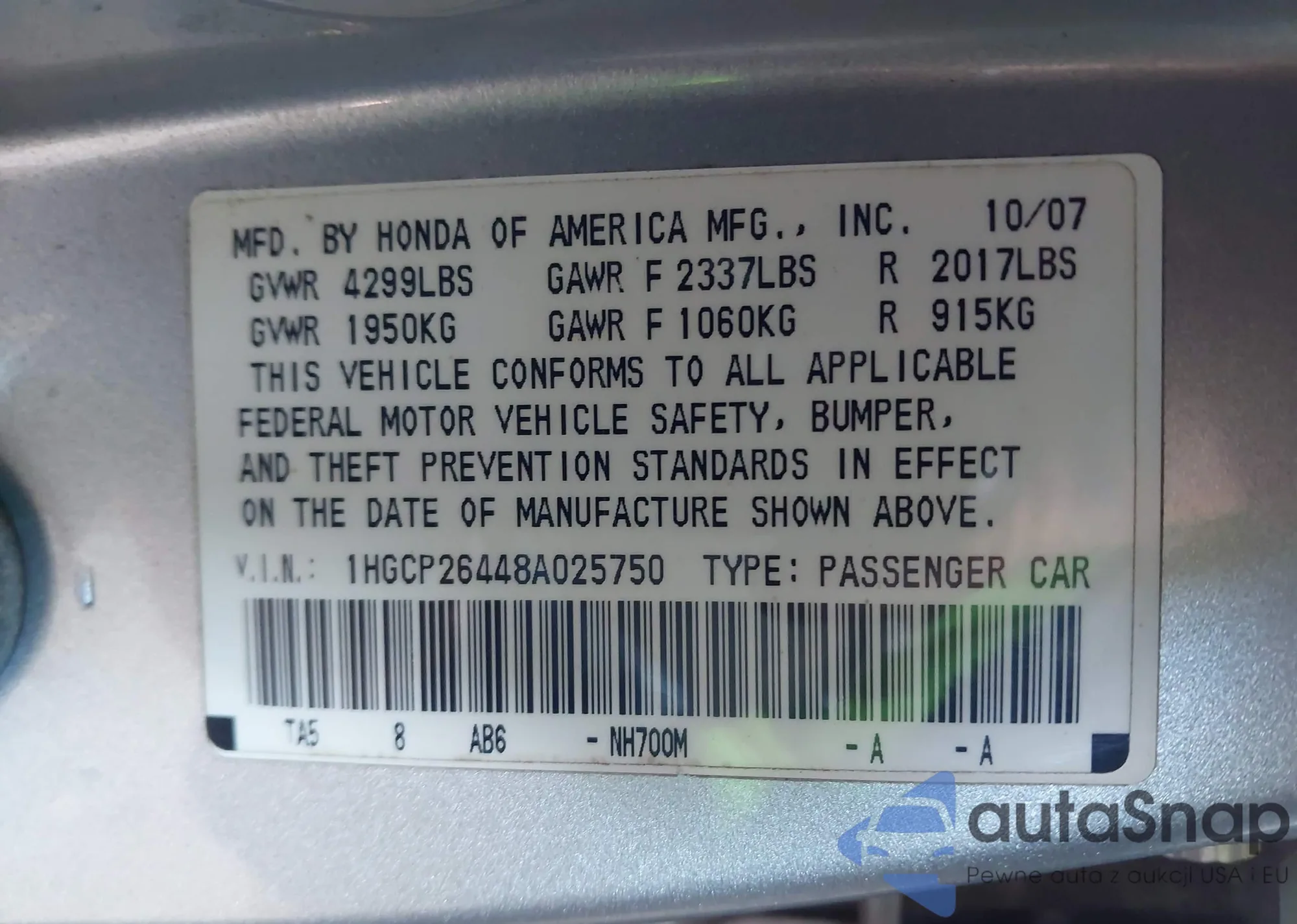 • VIN 1HGCP26448A025750