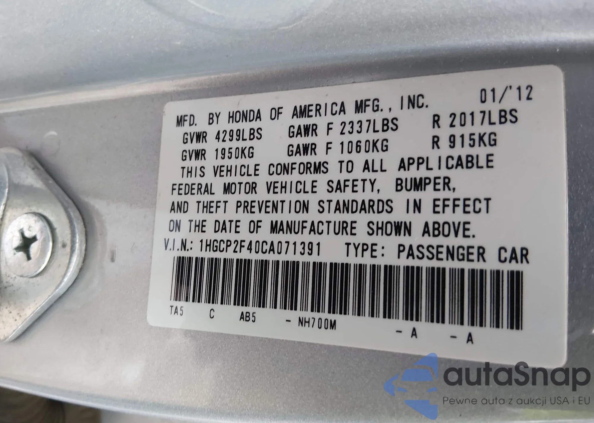 LOT: 43892946 VIN: 1HGCP2F40CA071391