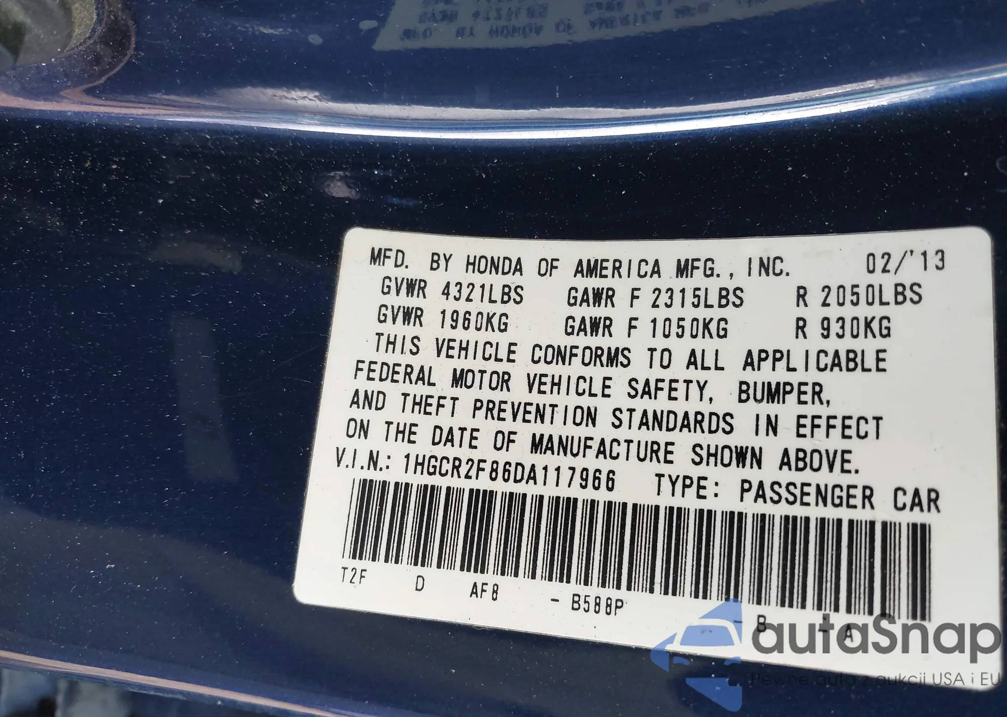 • VIN 1HGCR2F86DA117966