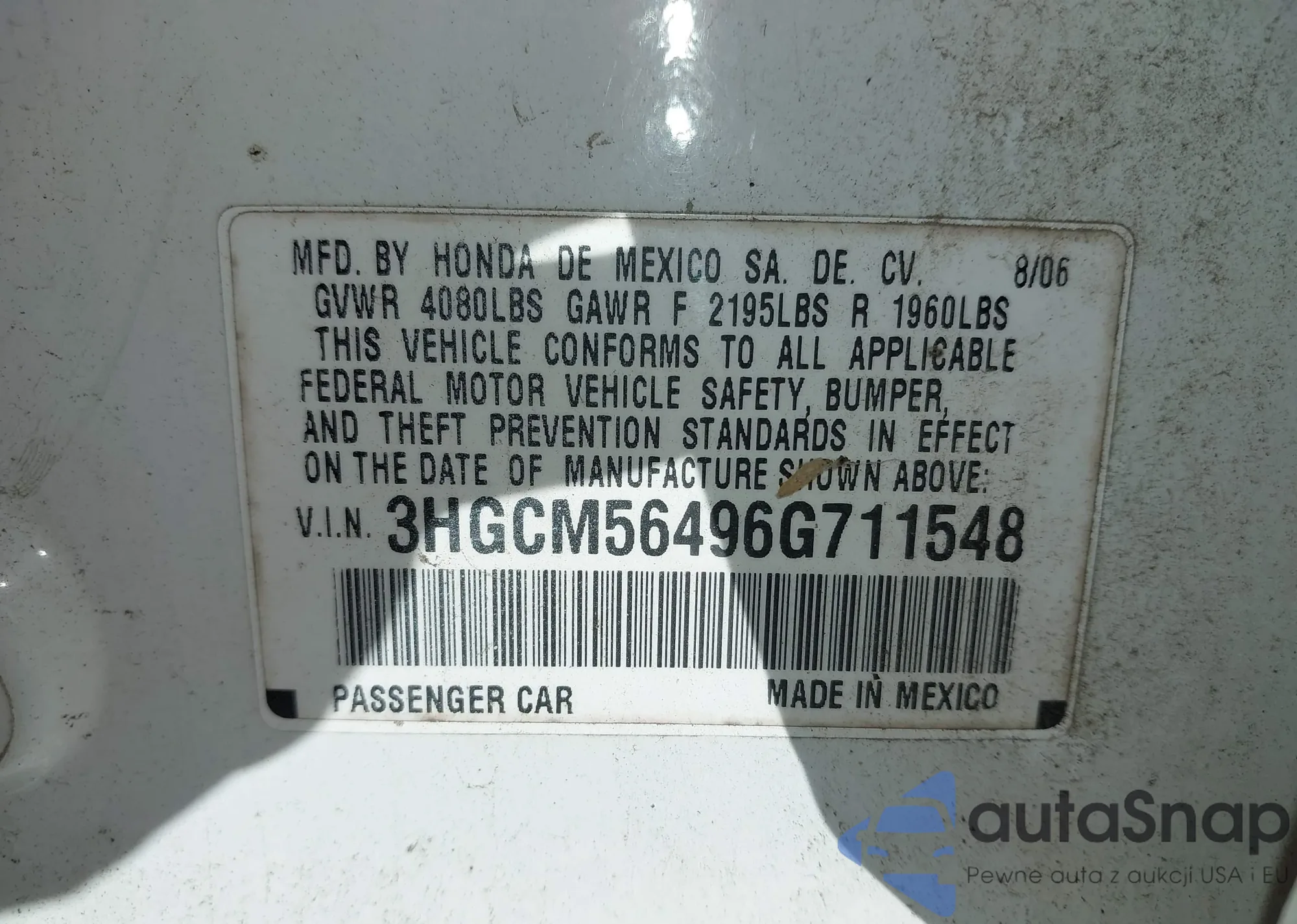 LOT: 44322141 VIN: 3HGCM56496G711548