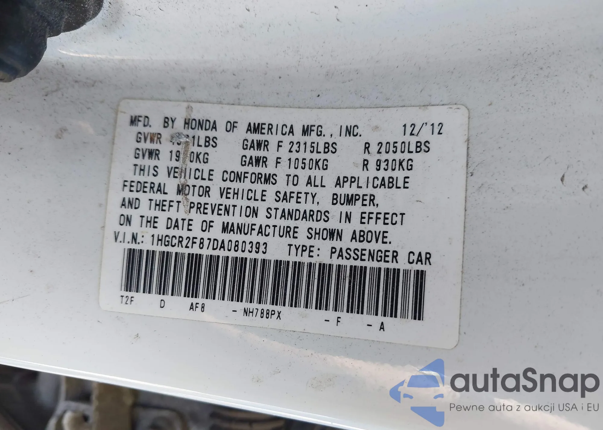 • VIN 1HGCR2F87DA080393