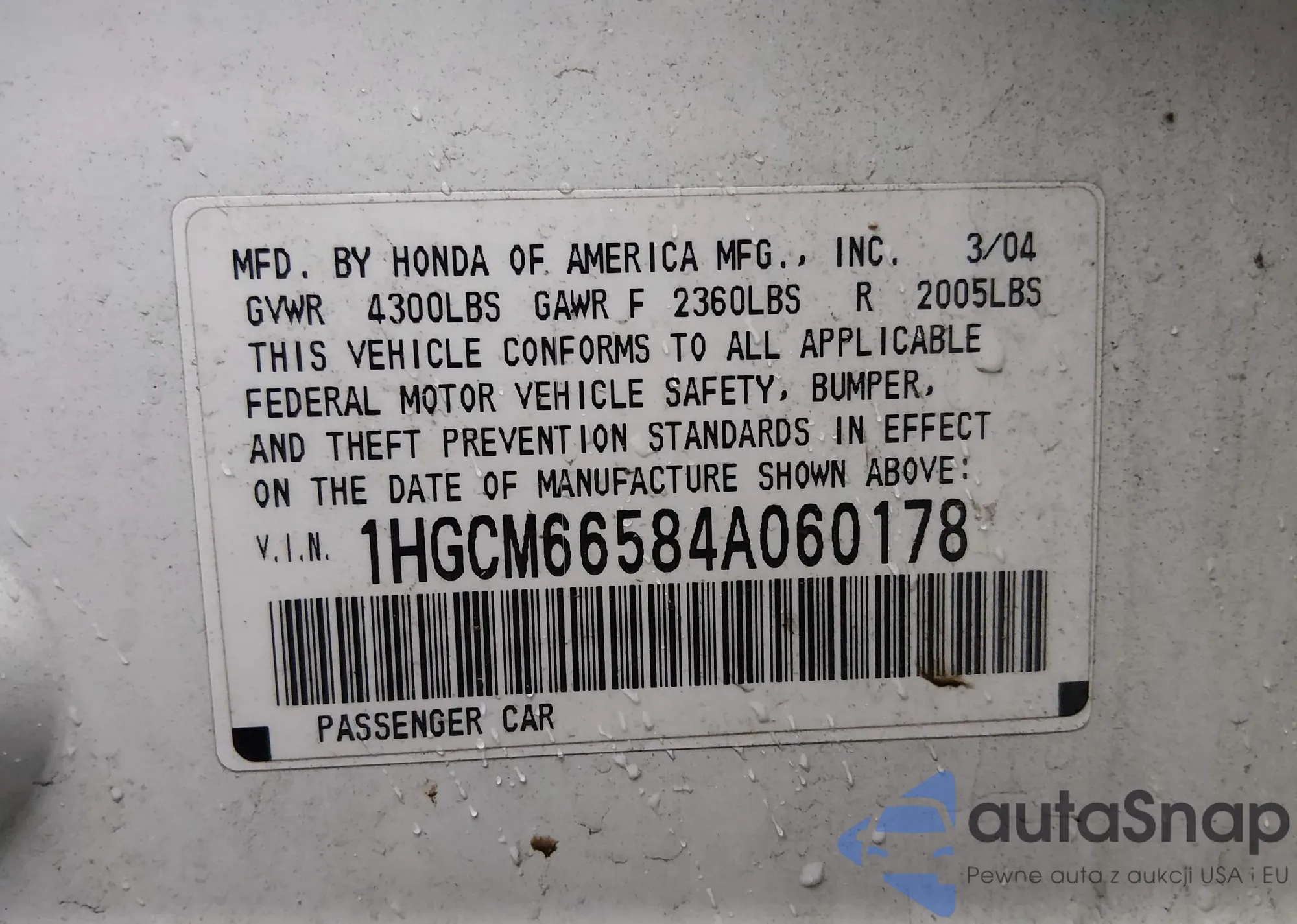 LOT: 43983578 VIN: 1HGCM66584A060178