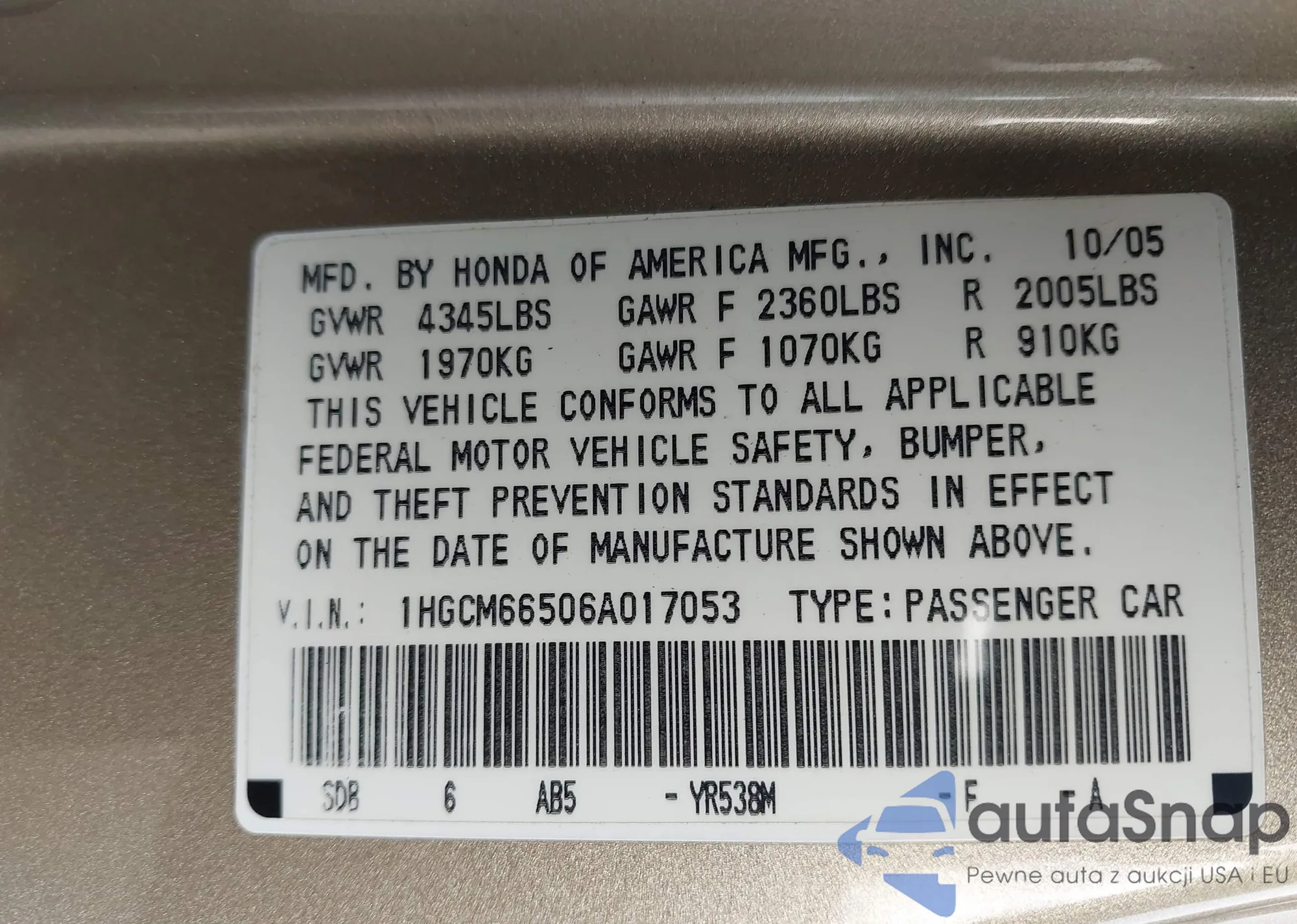 LOT: 44151338 VIN: 1HGCM66506A017053