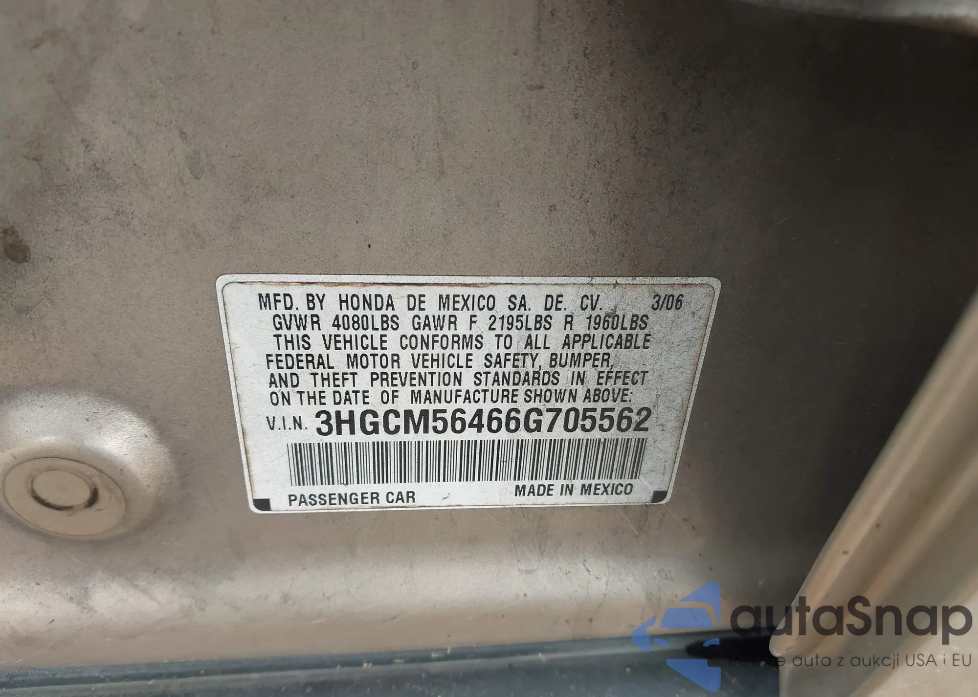 LOT: 44553543 VIN: 3HGCM56466G705562