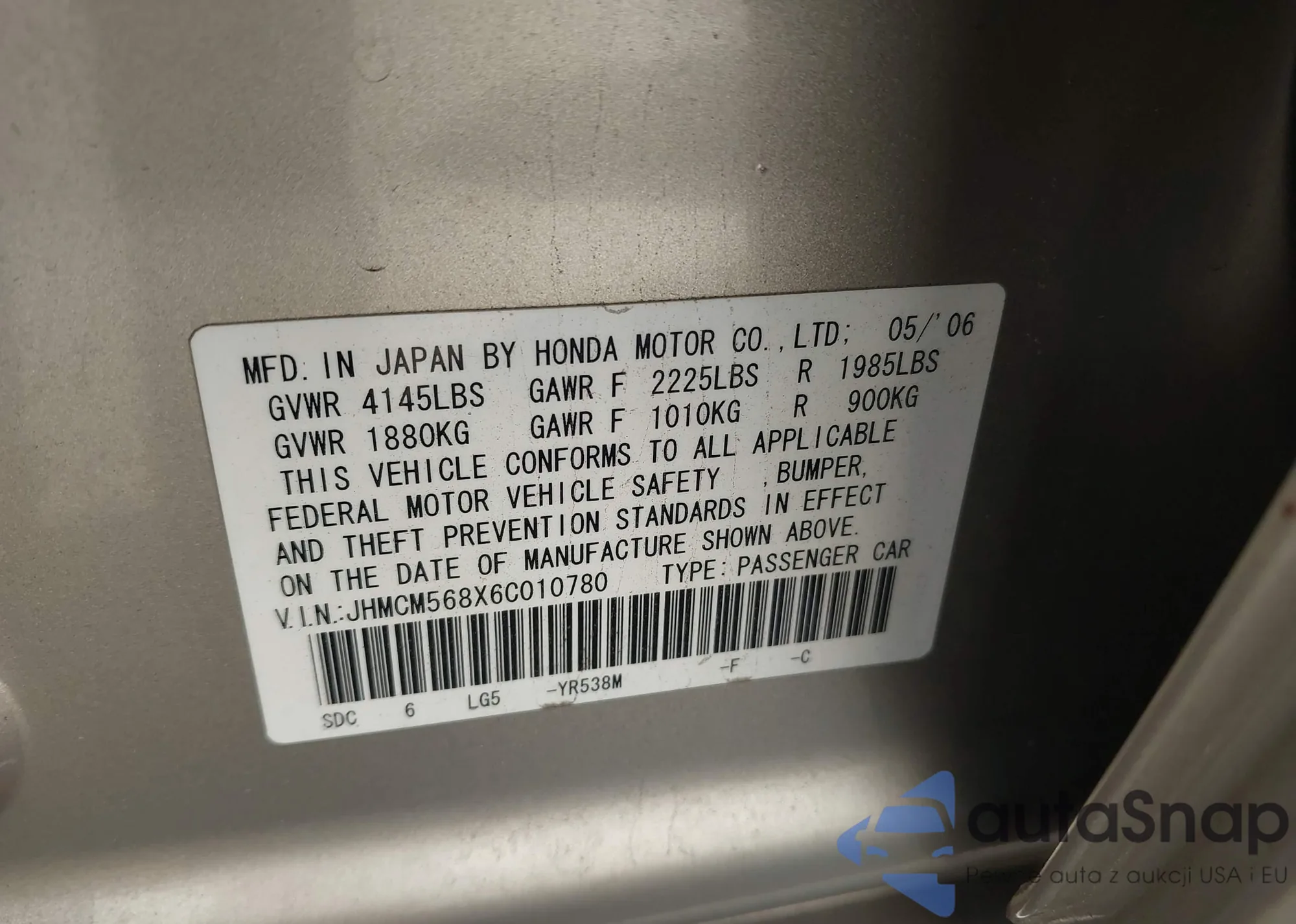 • VIN JHMCM568X6C010780