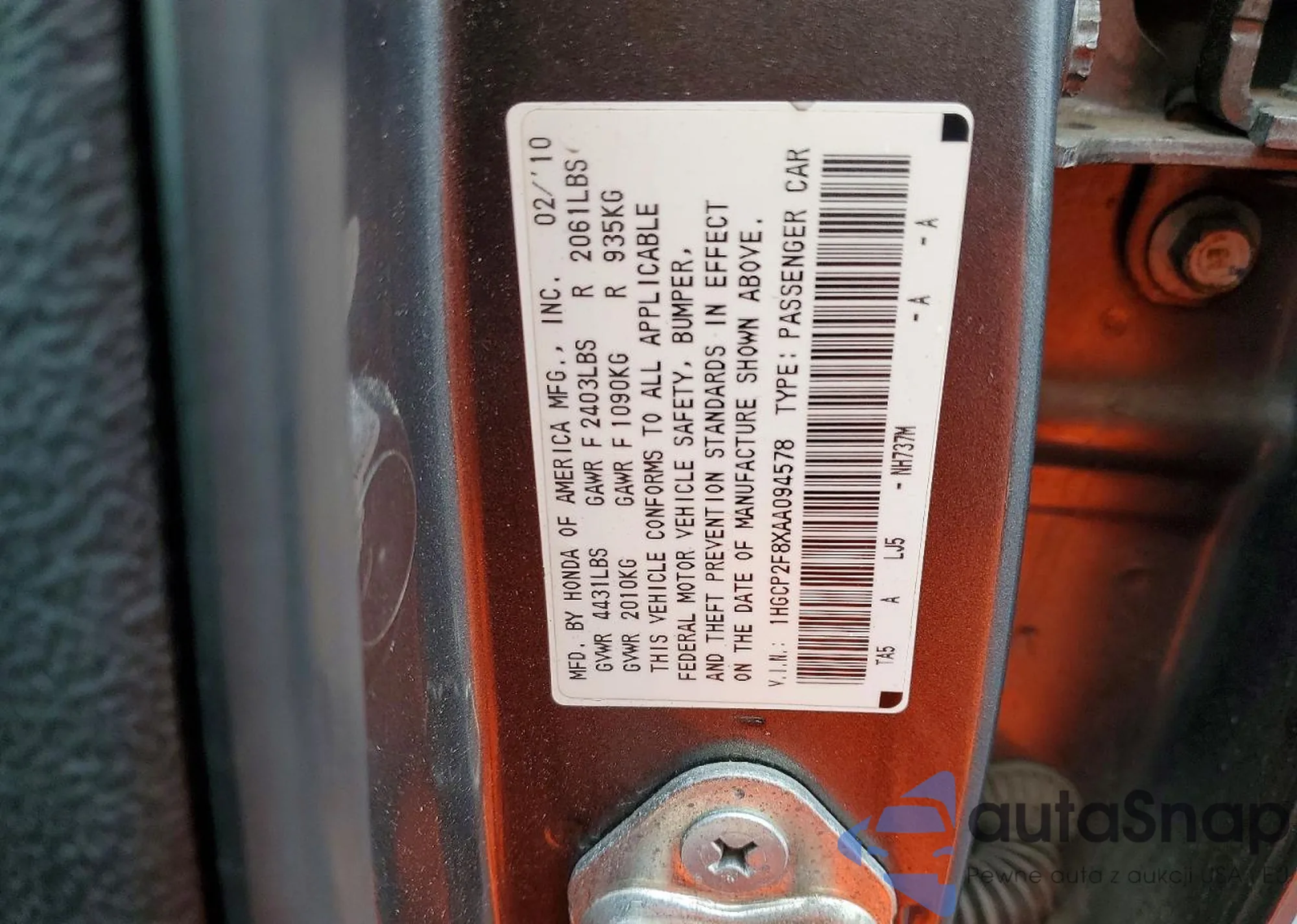 • VIN 1HGCP2F8XAA094578