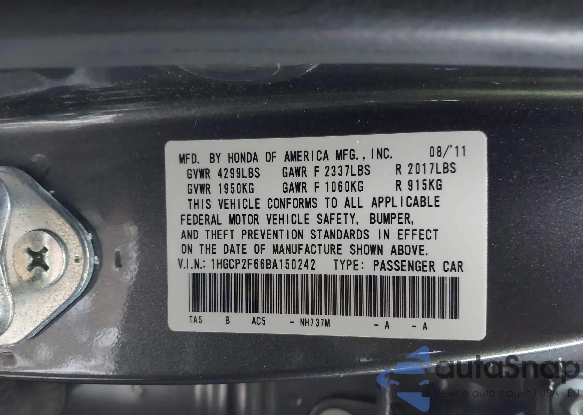 LOT: 44179226 VIN: 1HGCP2F66BA150242