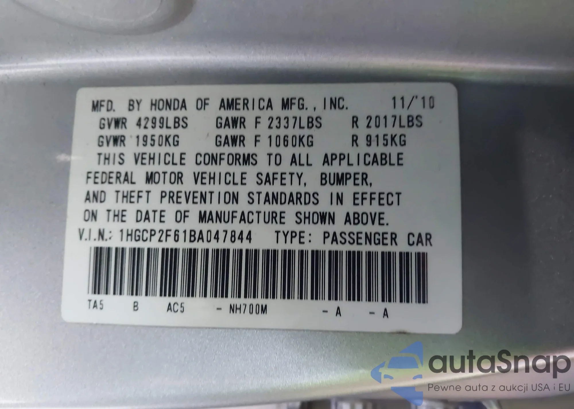 LOT: 44189345 VIN: 1HGCP2F61BA047844