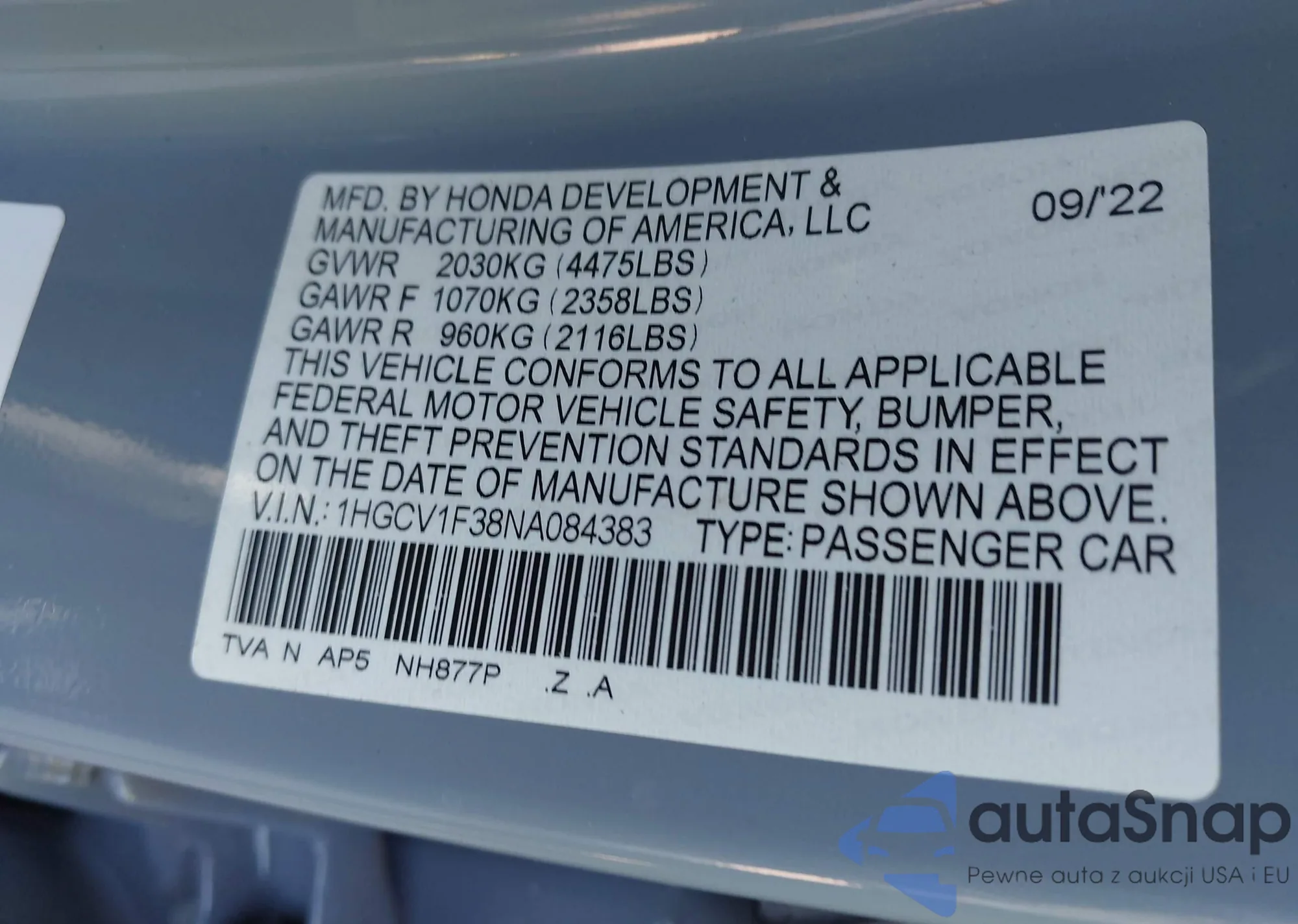 LOT: 43351604 VIN: 1HGCV1F38NA084383