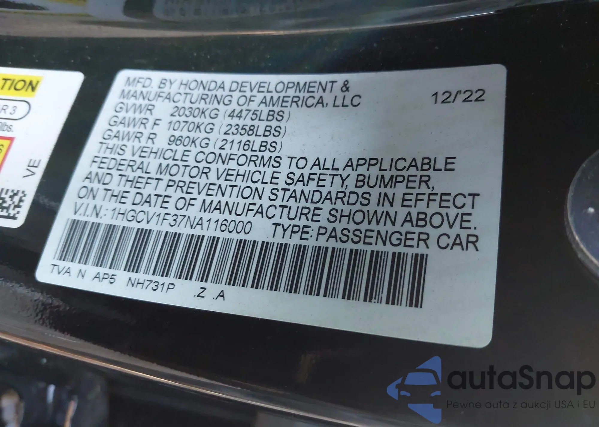 • VIN 1HGCV1F37NA116000
