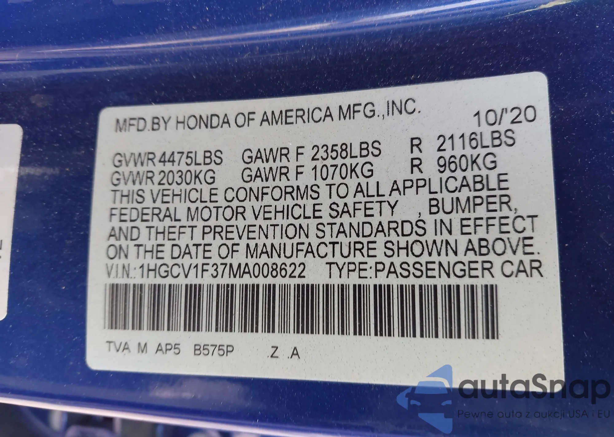 LOT: 43483667 VIN: 1HGCV1F37MA008622
