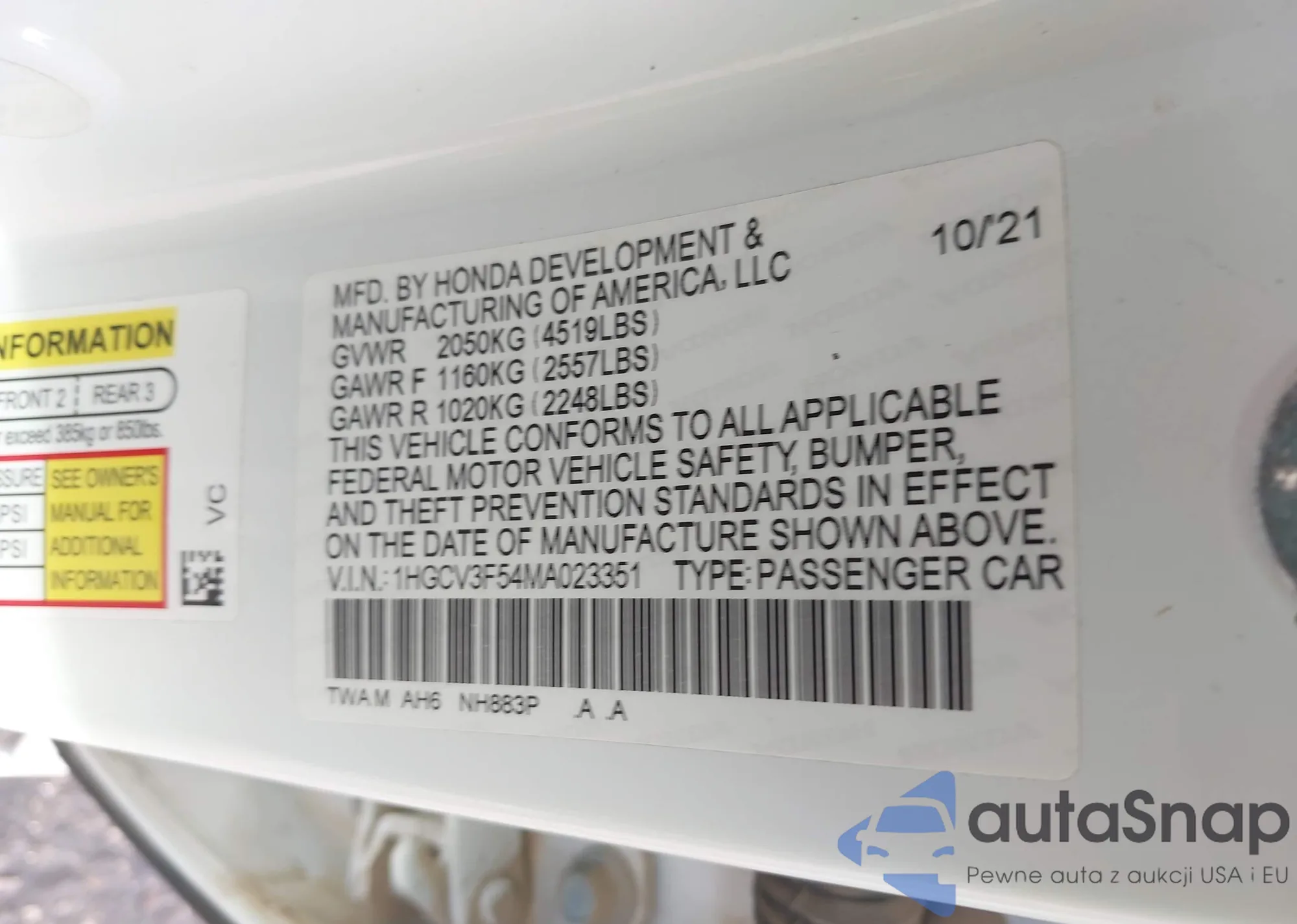 • VIN 1HGCV3F54MA023351