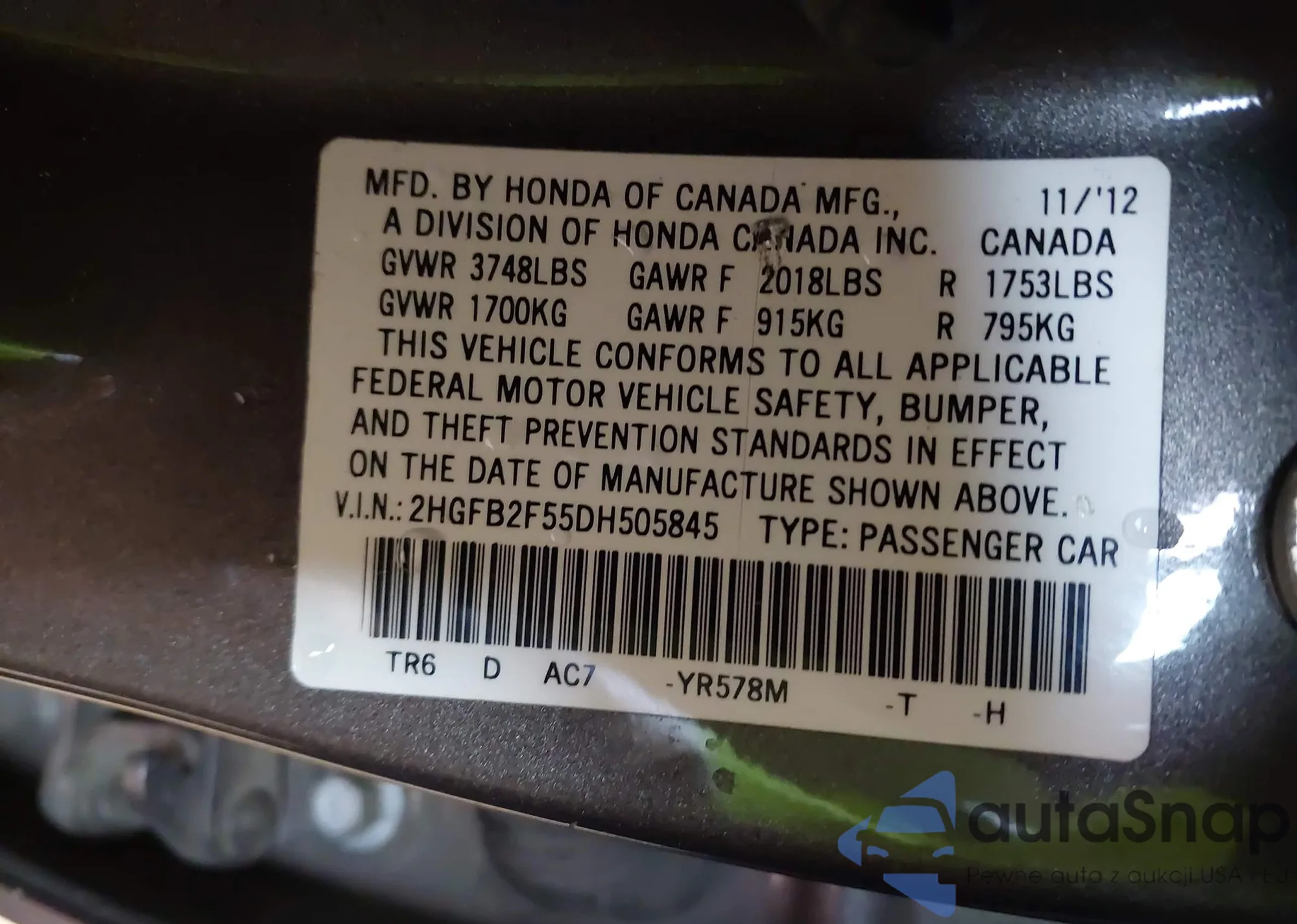 LOT: 44476410 VIN: 2HGFB2F55DH505845