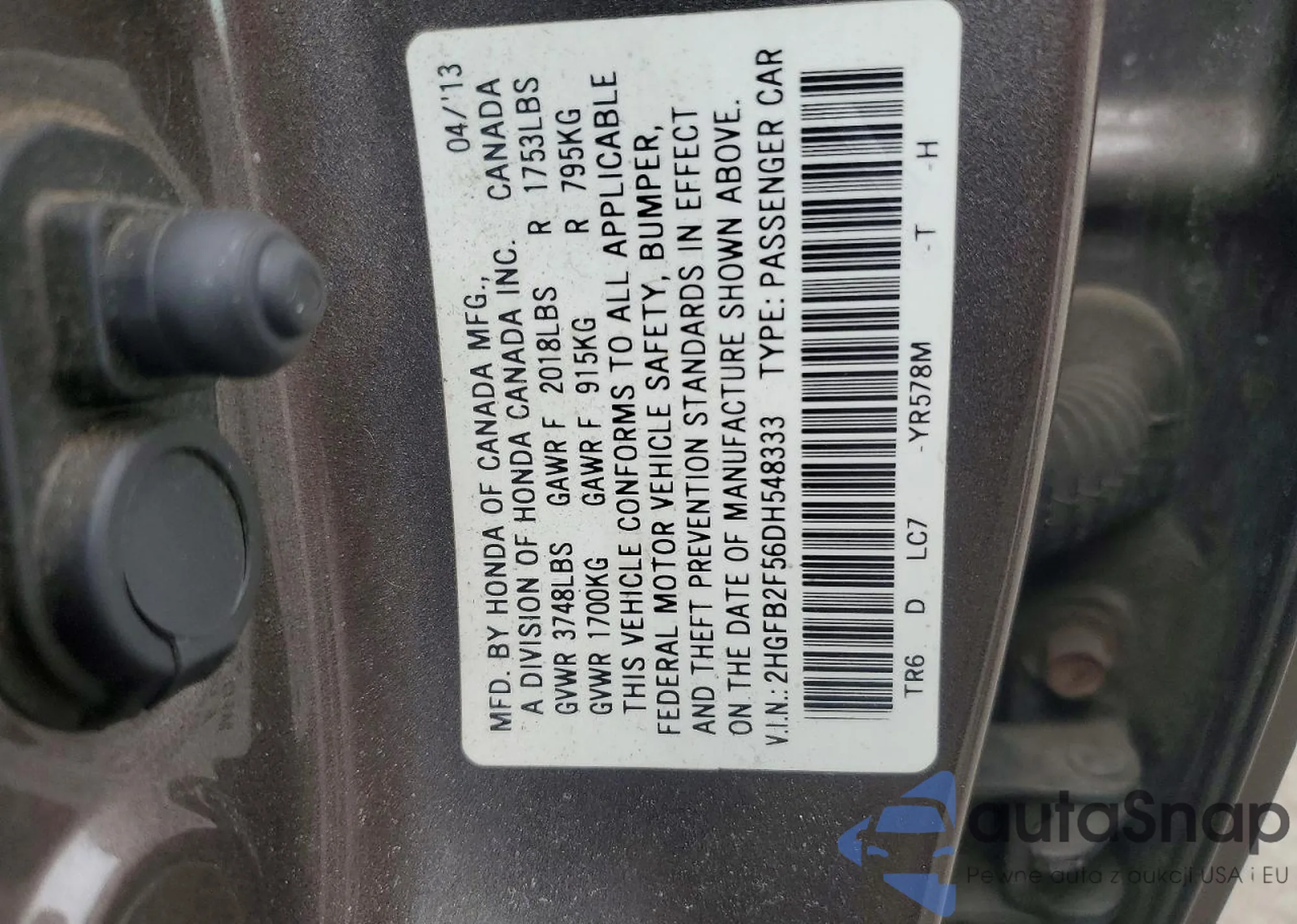LOT: 74210655 VIN: 2HGFB2F56DH548333