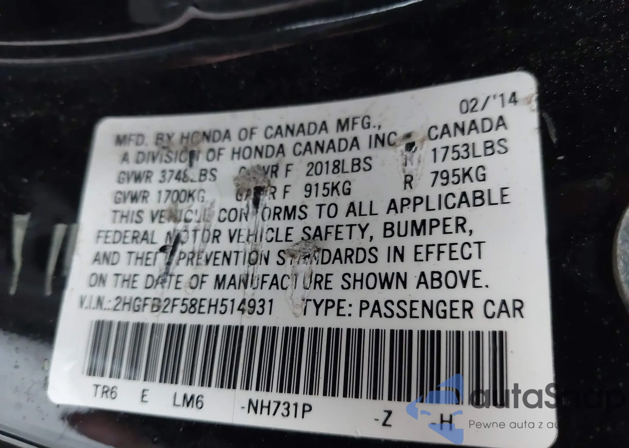 • VIN 2HGFB2F58EH514931