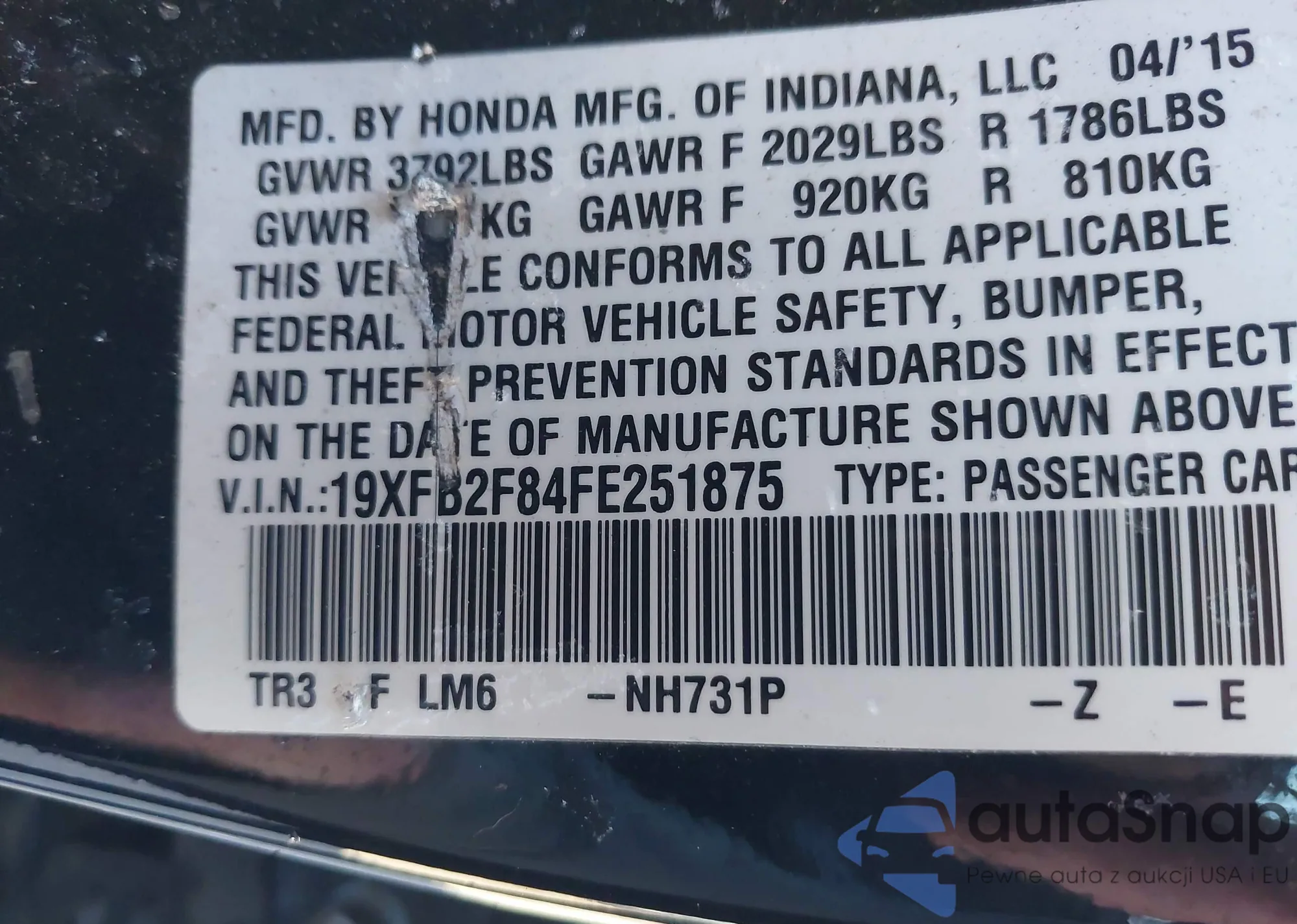 LOT: 44139968 VIN: 19XFB2F84FE251875