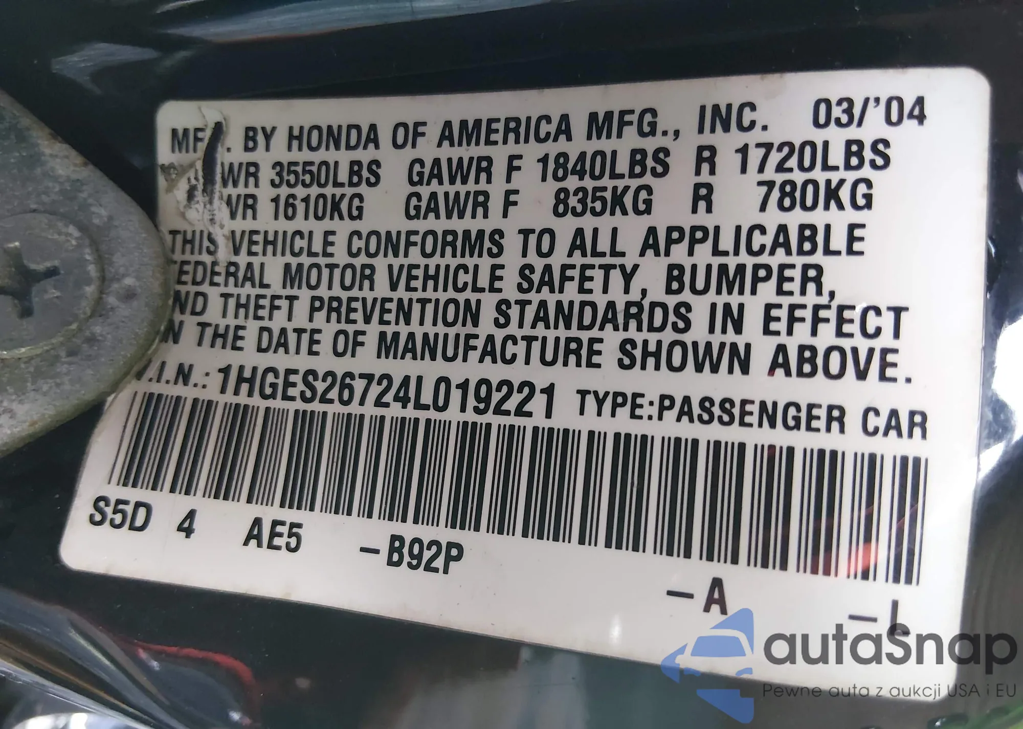 LOT: 44220359 VIN: 1HGES26724L019221