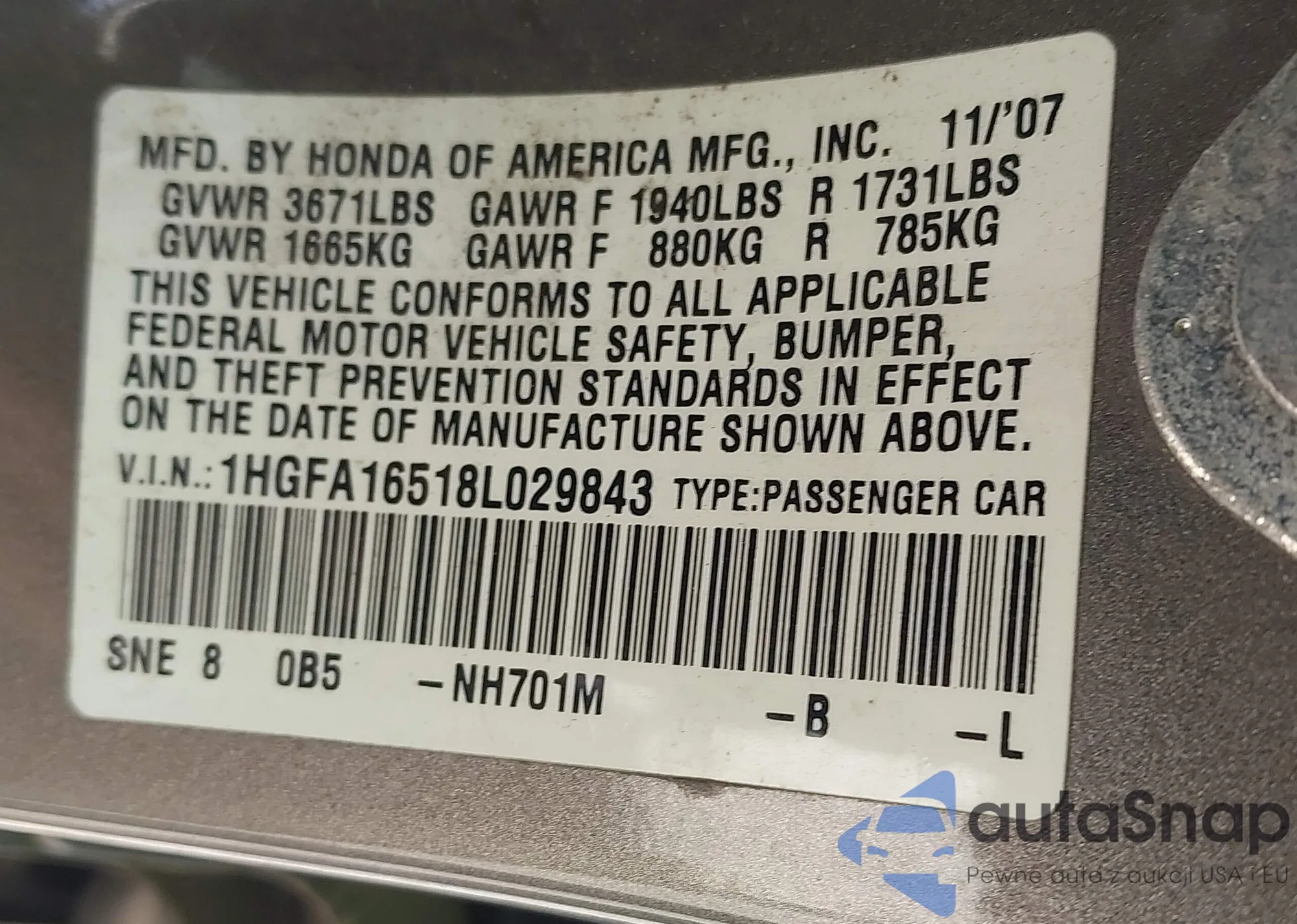 LOT: 43458956 VIN: 1HGFA16518L029843