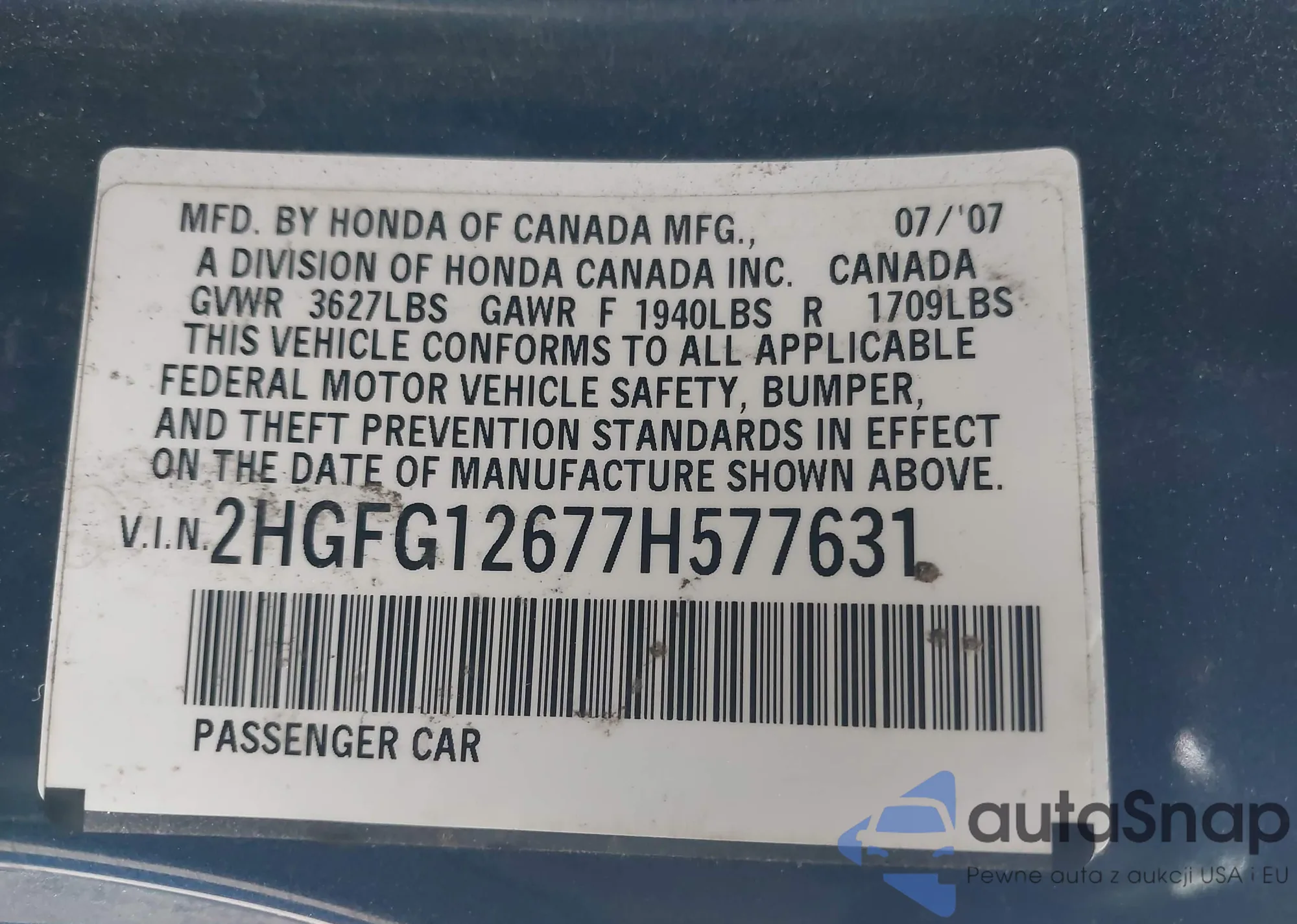 LOT: 44209800 VIN: 2HGFG12677H577631