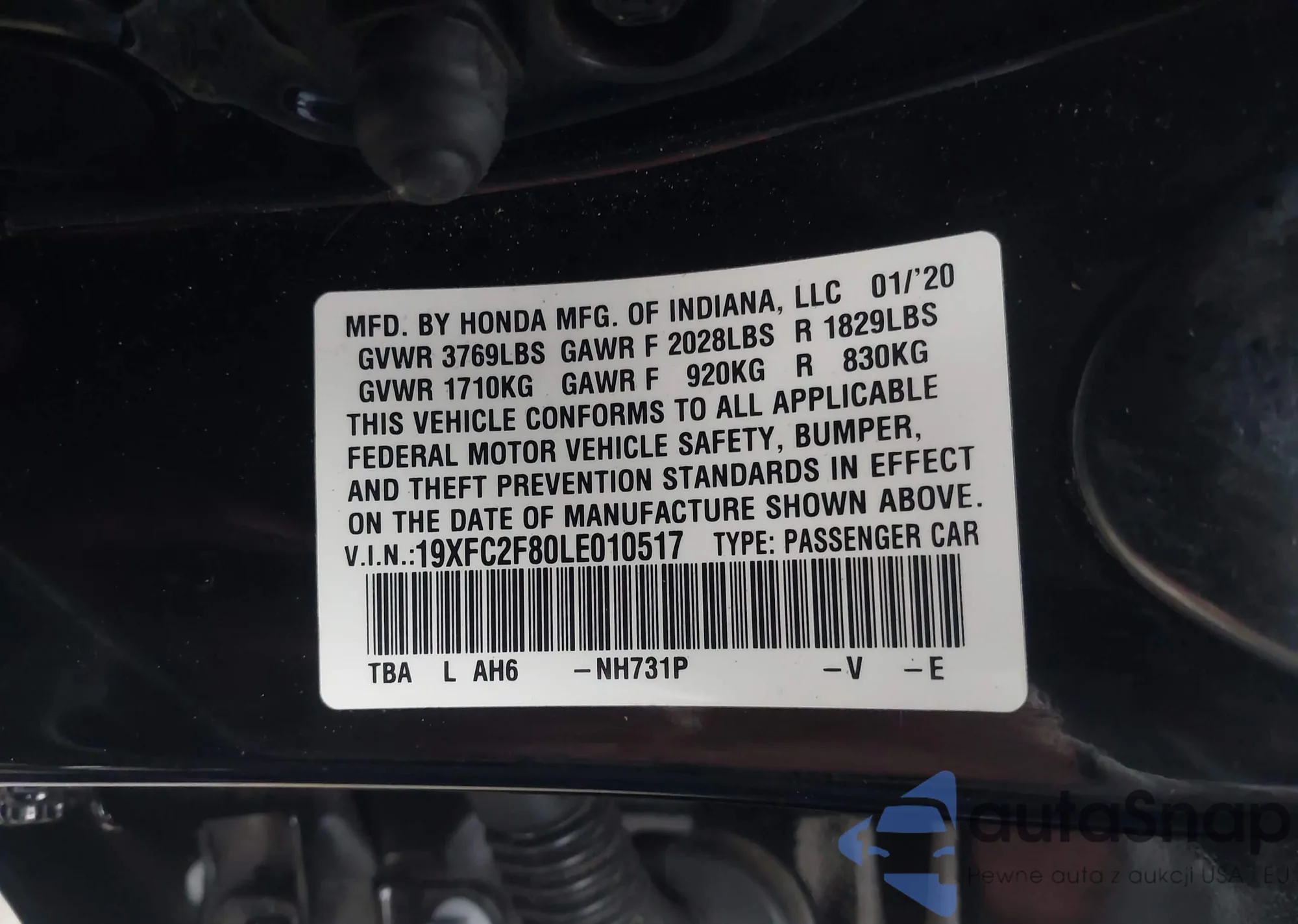 LOT: 43967285 VIN: 19XFC2F80LE010517