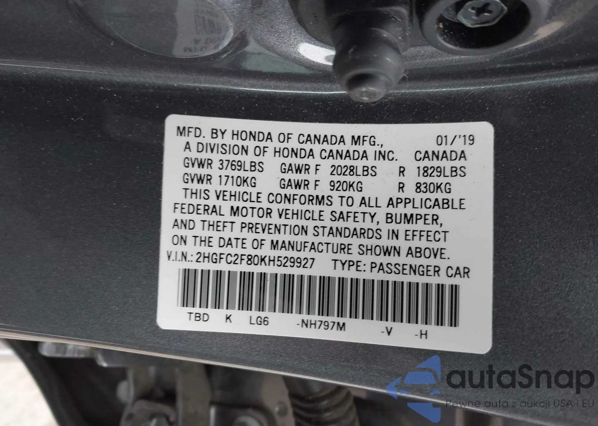 LOT: 44030178 VIN: 2HGFC2F80KH529927