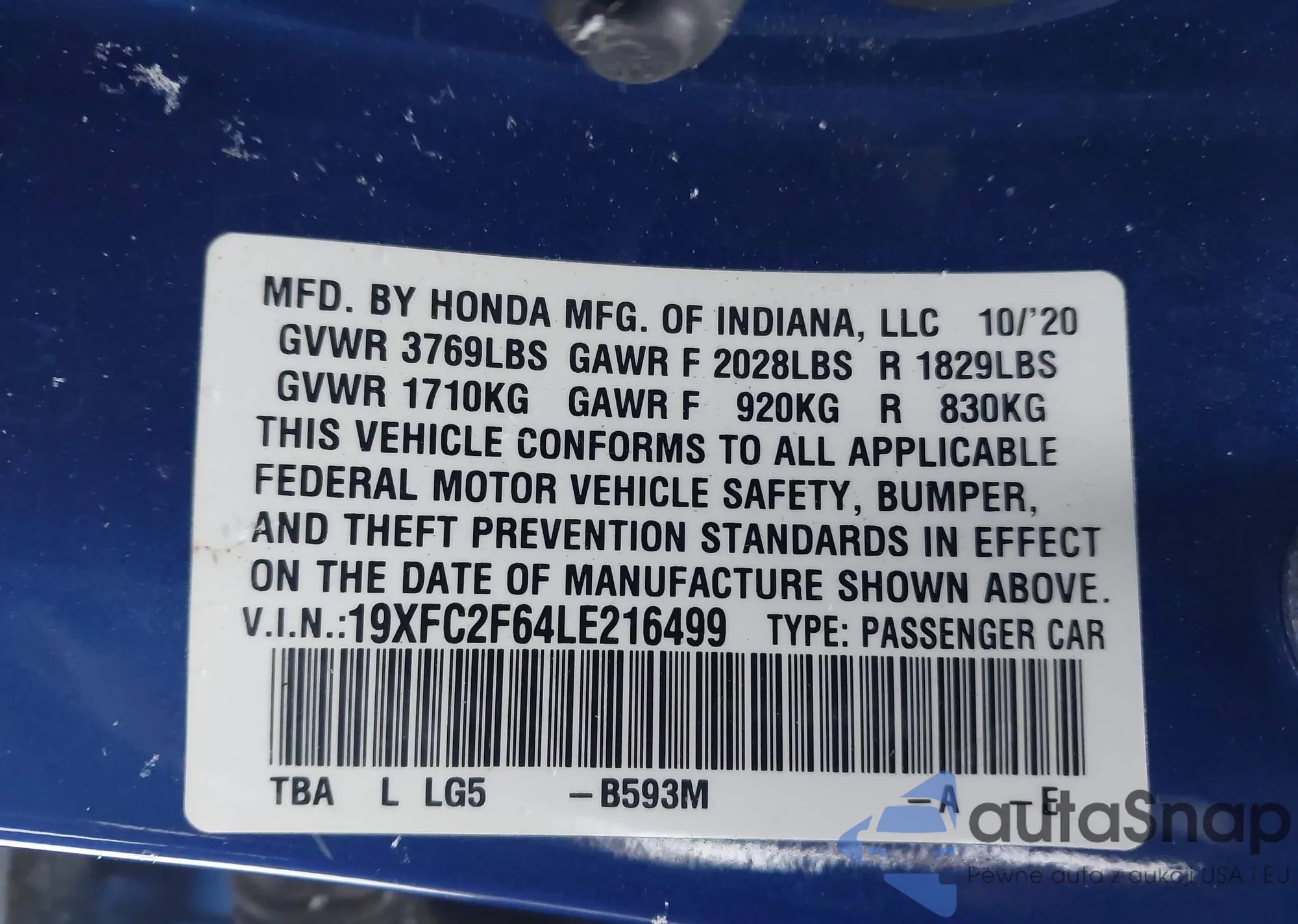 • VIN 19XFC2F64LE216499