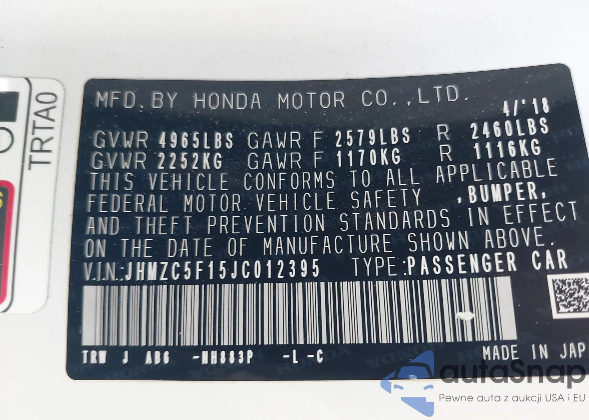 LOT: 79937175 VIN: JHMZC5F39JC006259