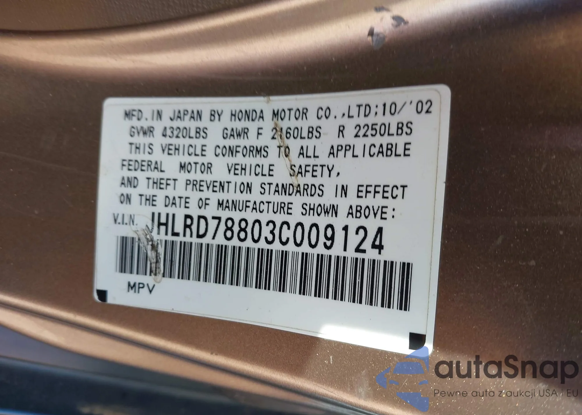 • VIN JHLRD78803C009124