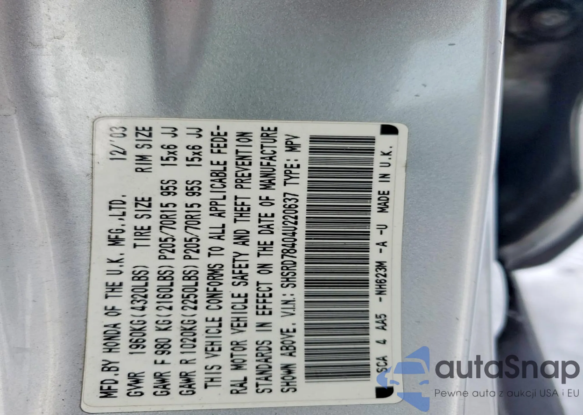 • VIN SHSRD78404U220637