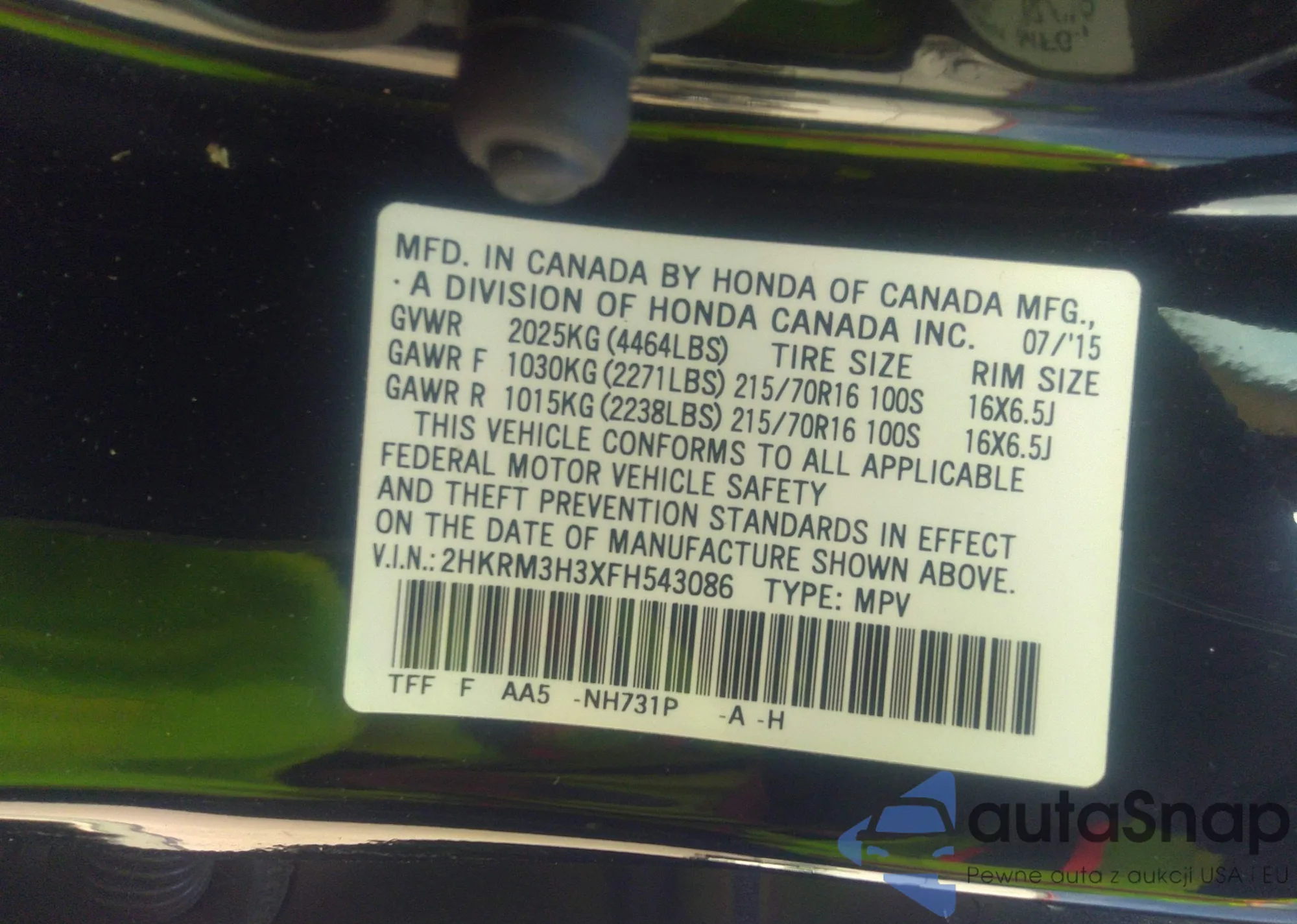 • VIN 2HKRM3H3XFH543086