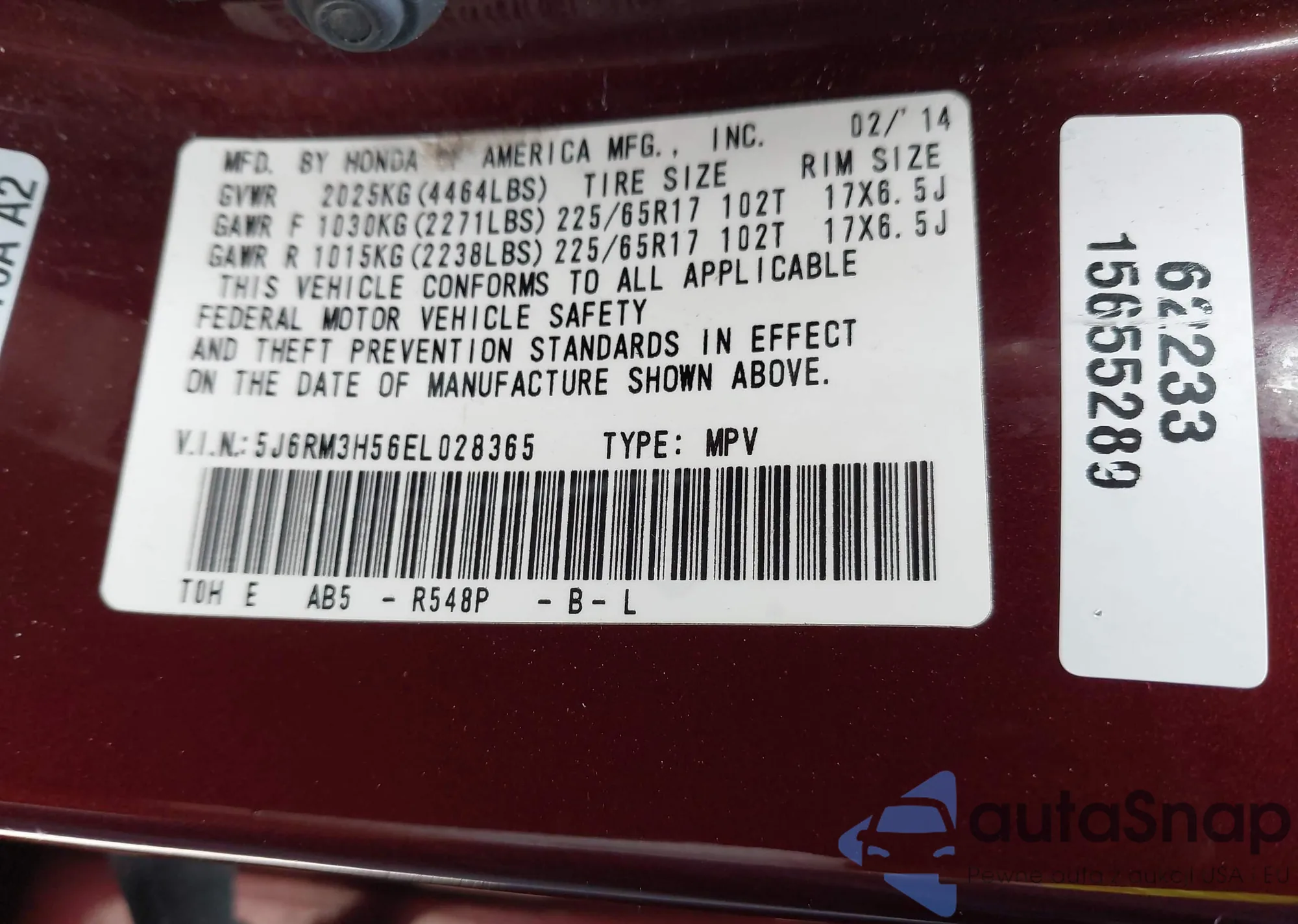 • VIN 2HKRM3H7XFH533130