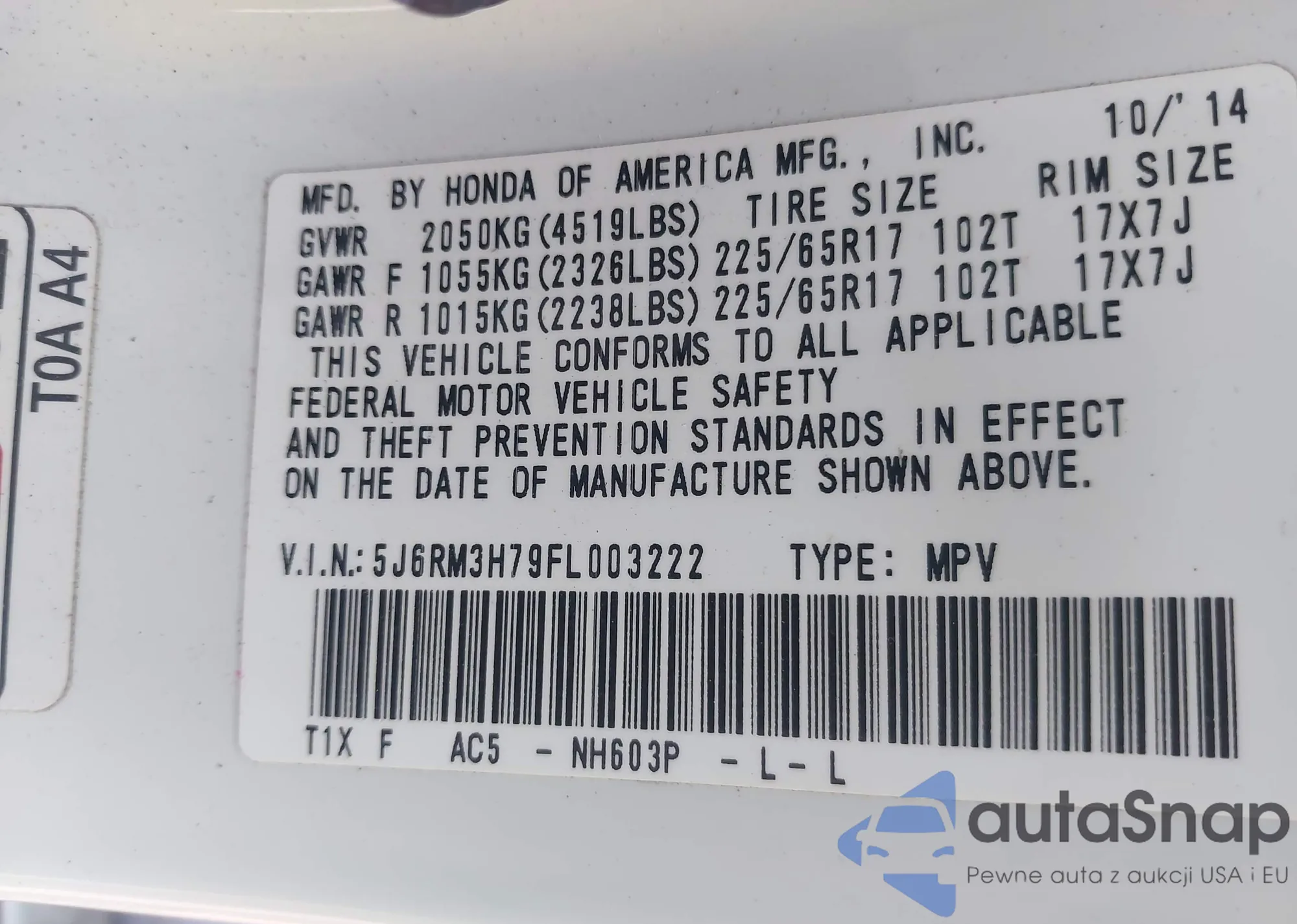 • VIN 5J6RM3H79FL003222