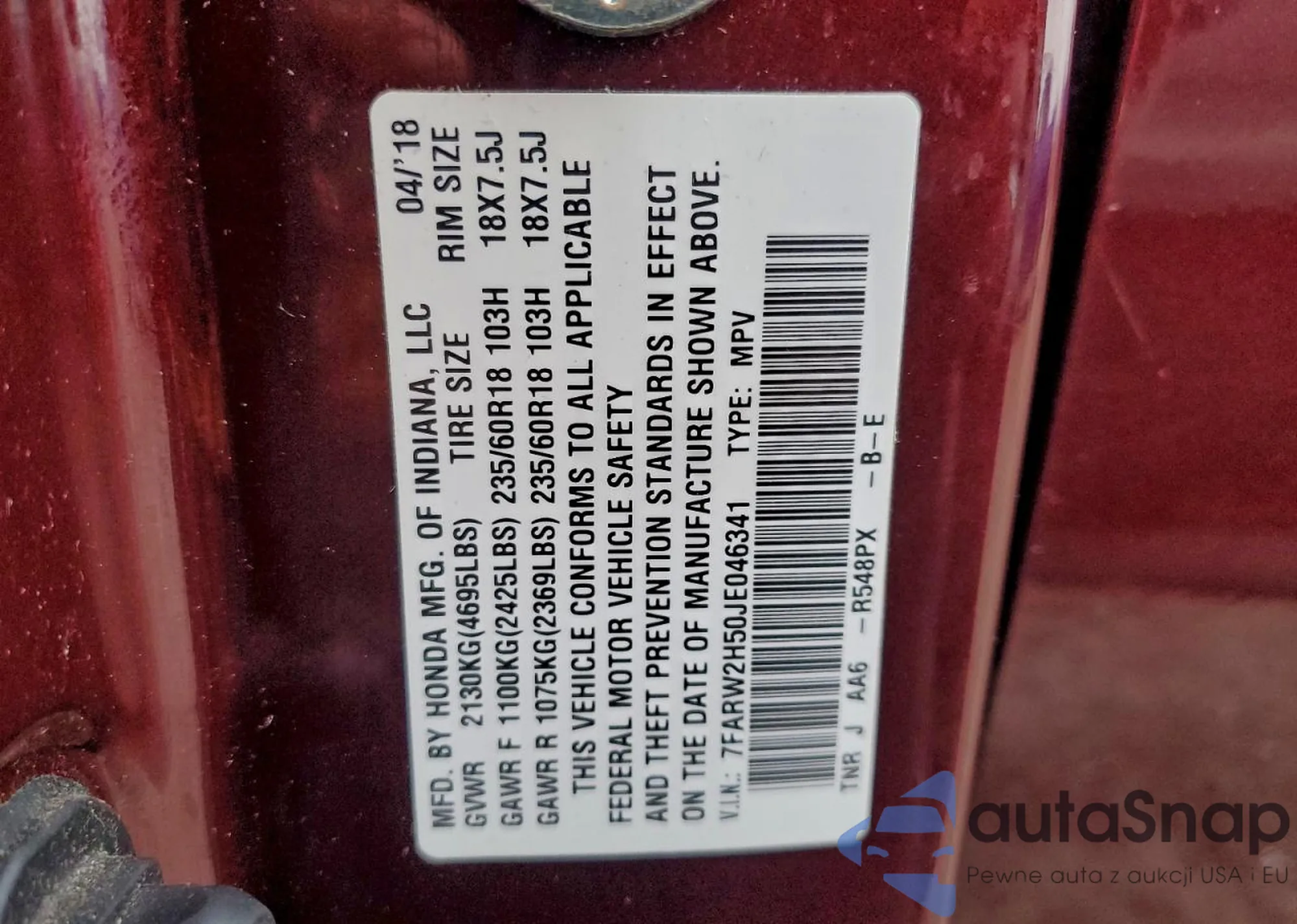 • VIN 2HKRW2H99JH645982