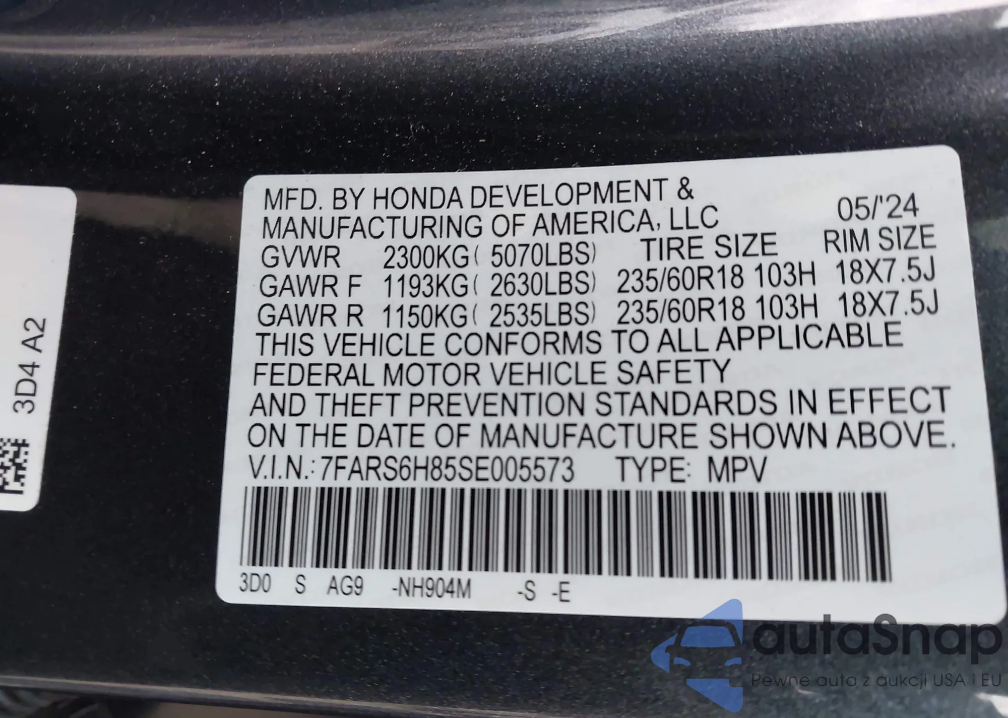 • VIN 2HKRW1H5XLH417533