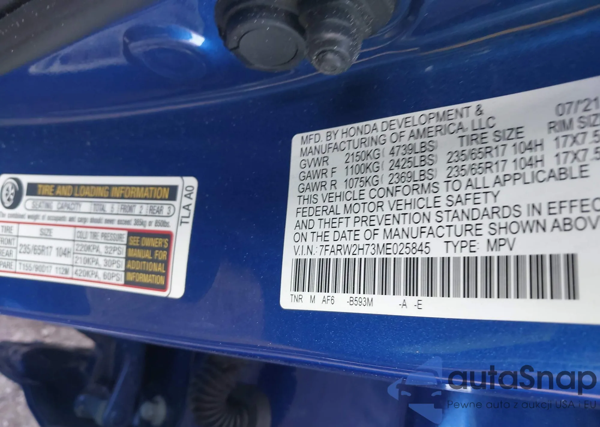 • VIN 5J6RW2H73ML026707
