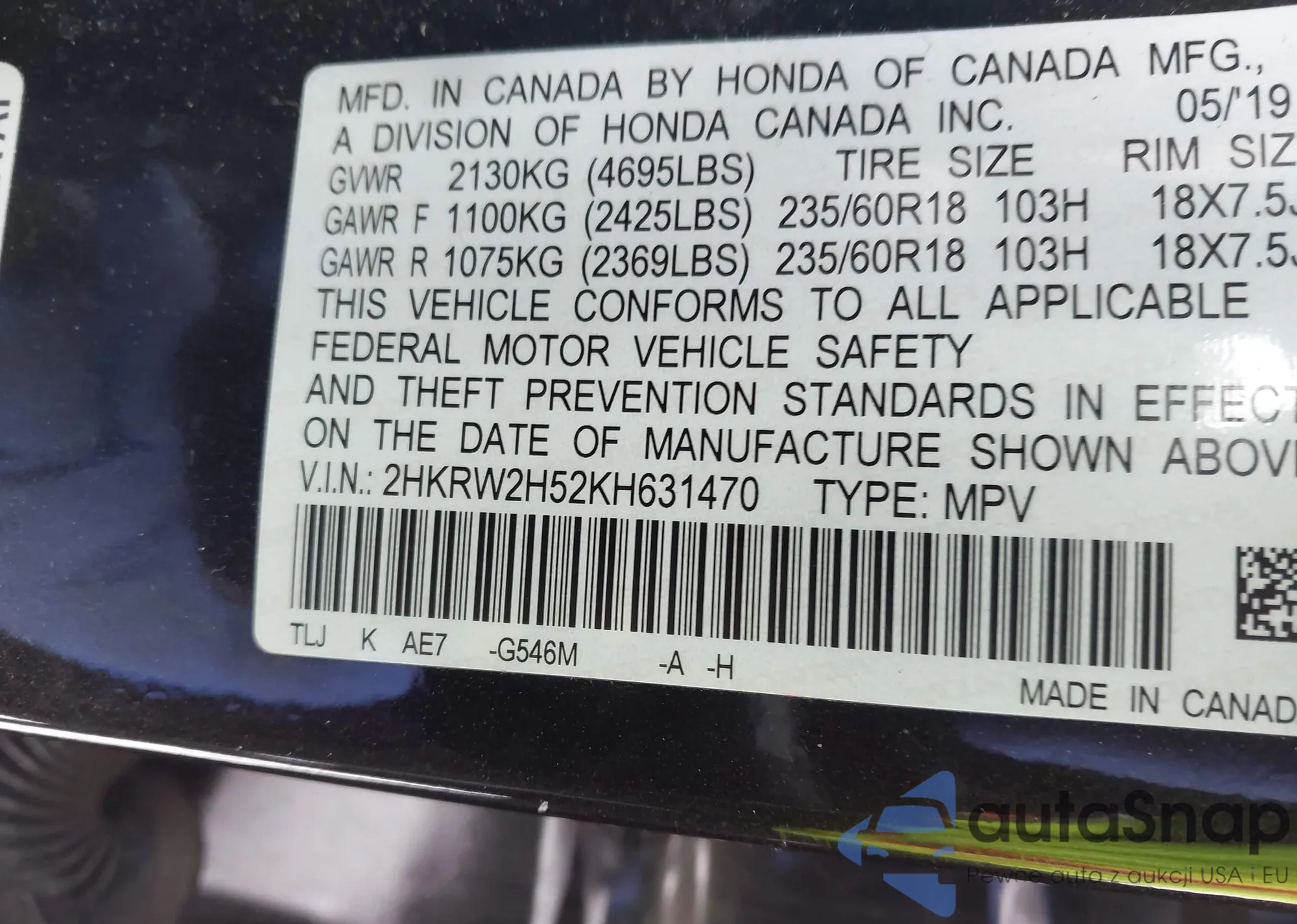 • VIN 2HKRW2H52KH631470
