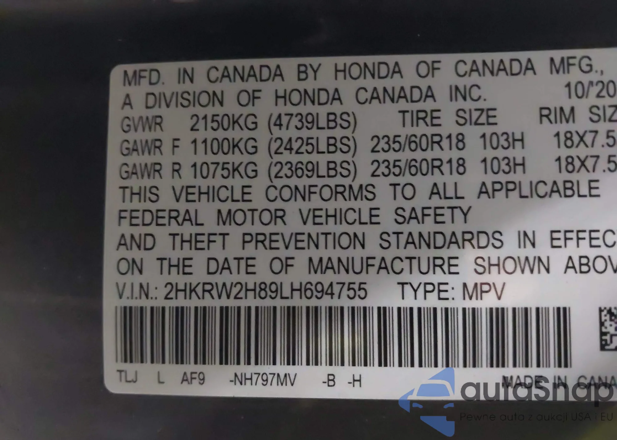 • VIN 2HKRW2H89LH694755