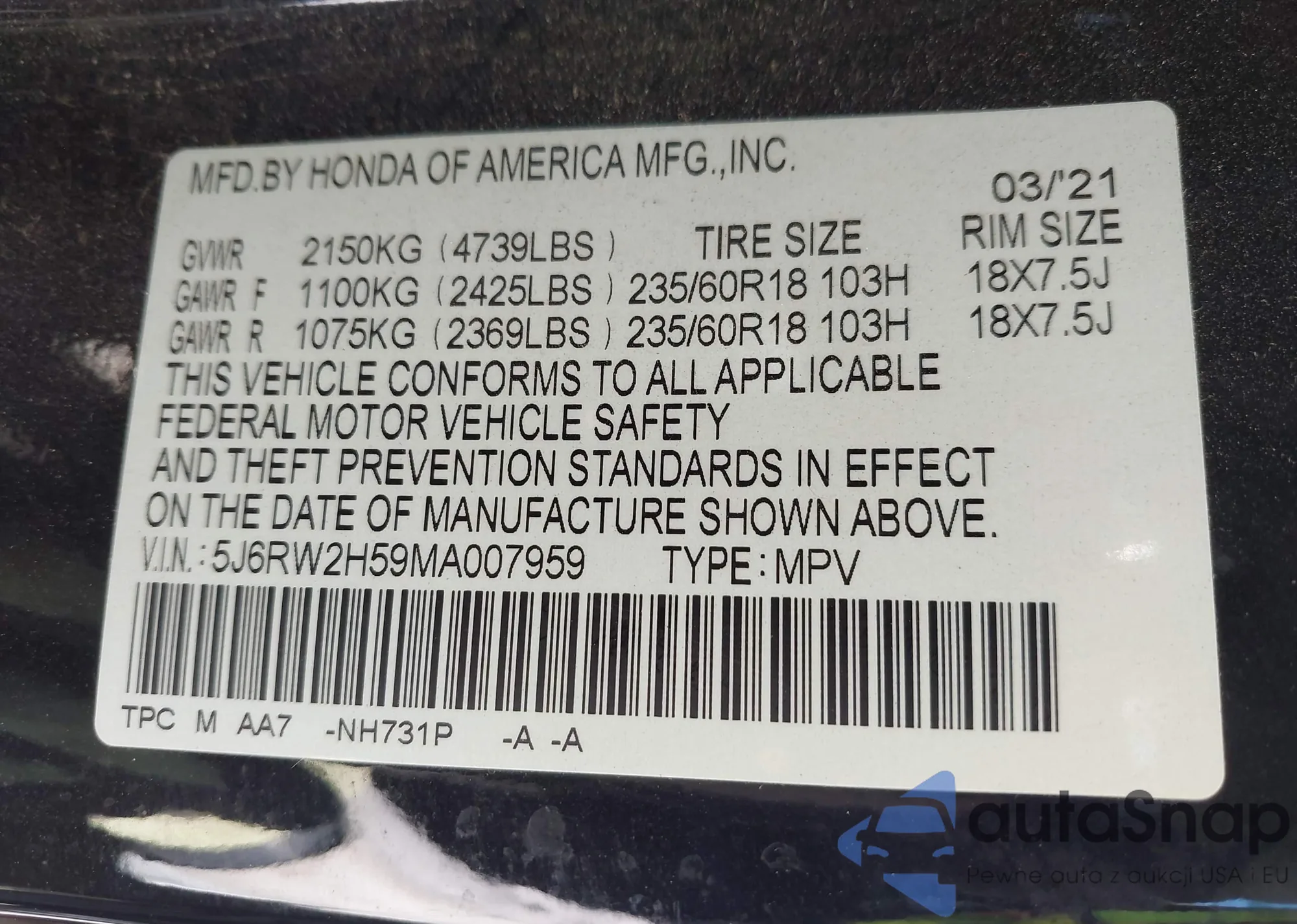 • VIN 5J6RW2H59MA007959