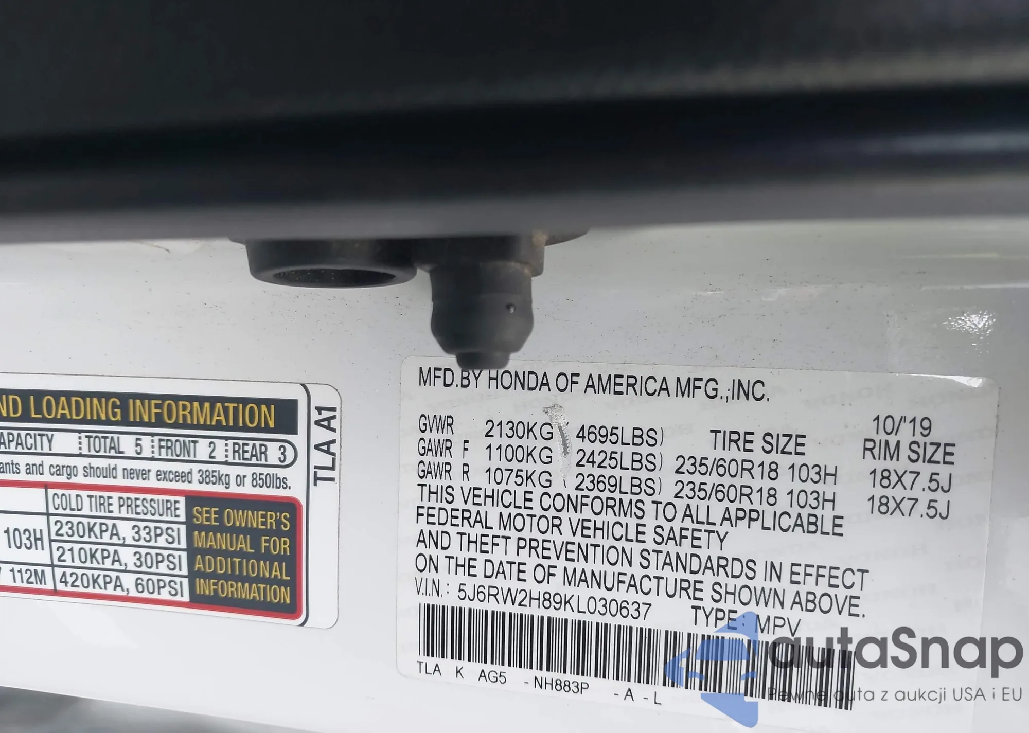 • VIN 5J6RW2H89KL030637