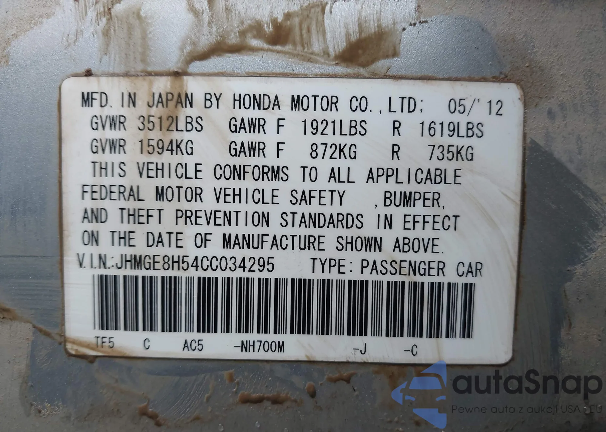 LOT: 43957504 VIN: JHMGE8H54CC034295