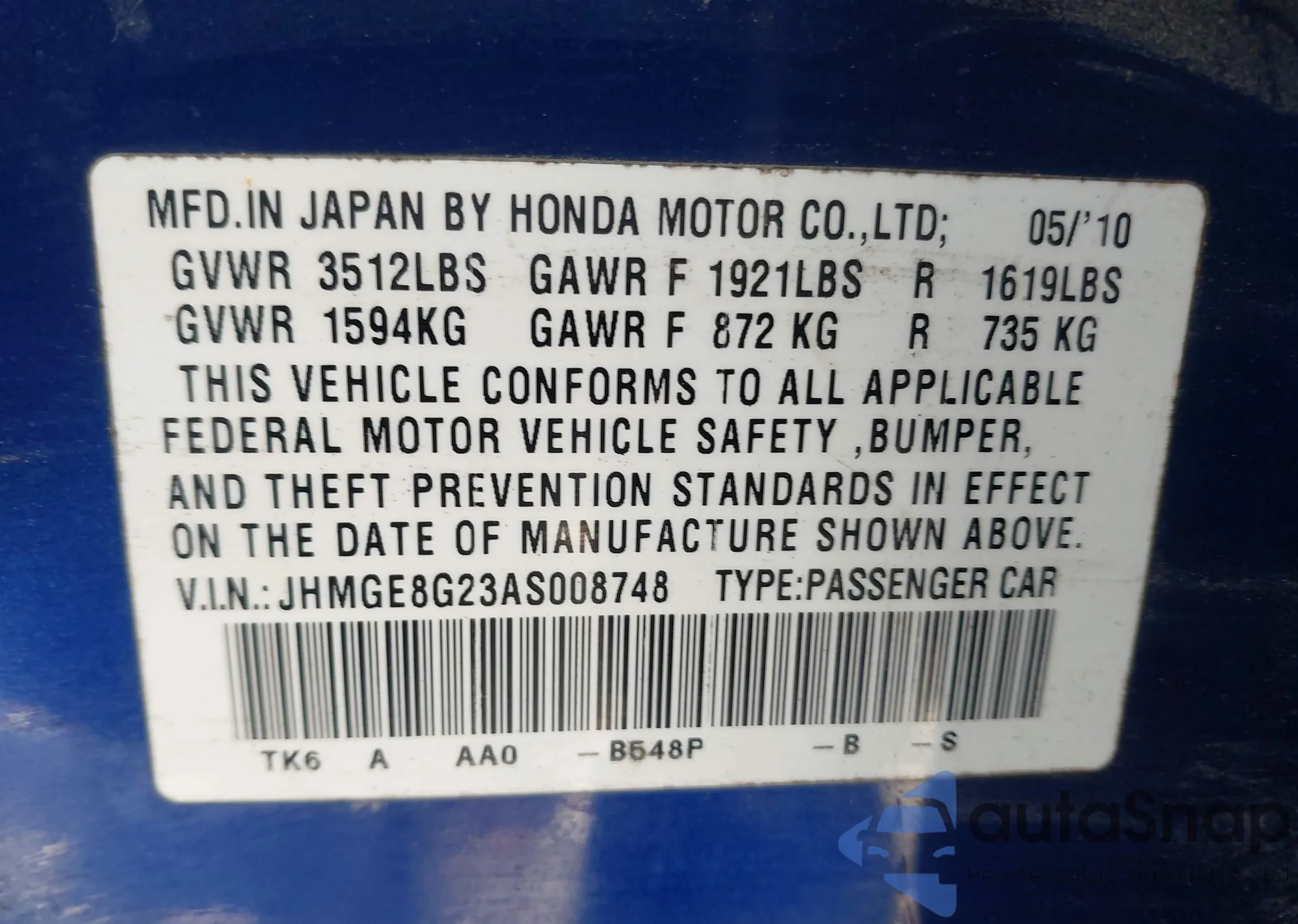 LOT: 44034724 VIN: JHMGE8G23AS008748
