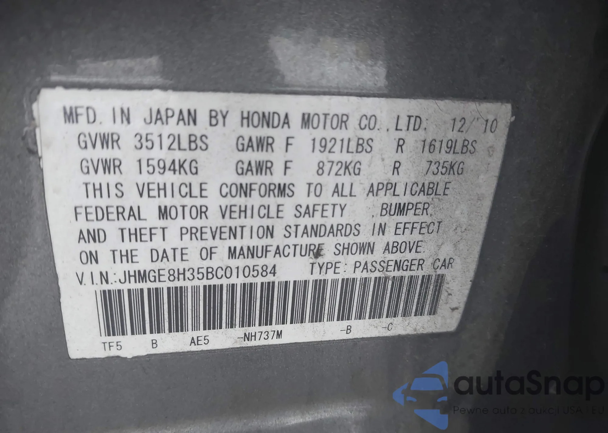 • VIN JHMGE8H35BC010584