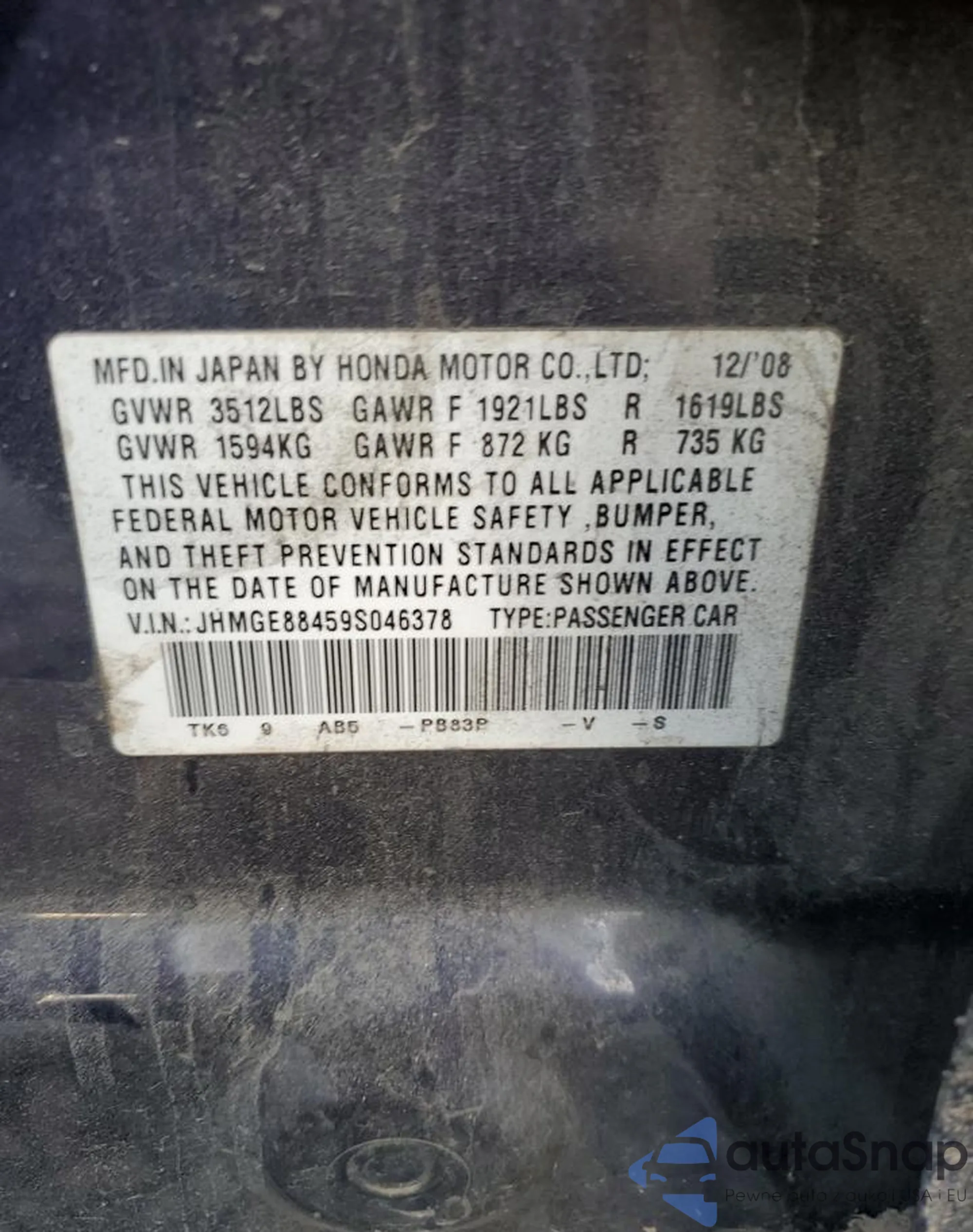 • VIN JHMGE88459S046378