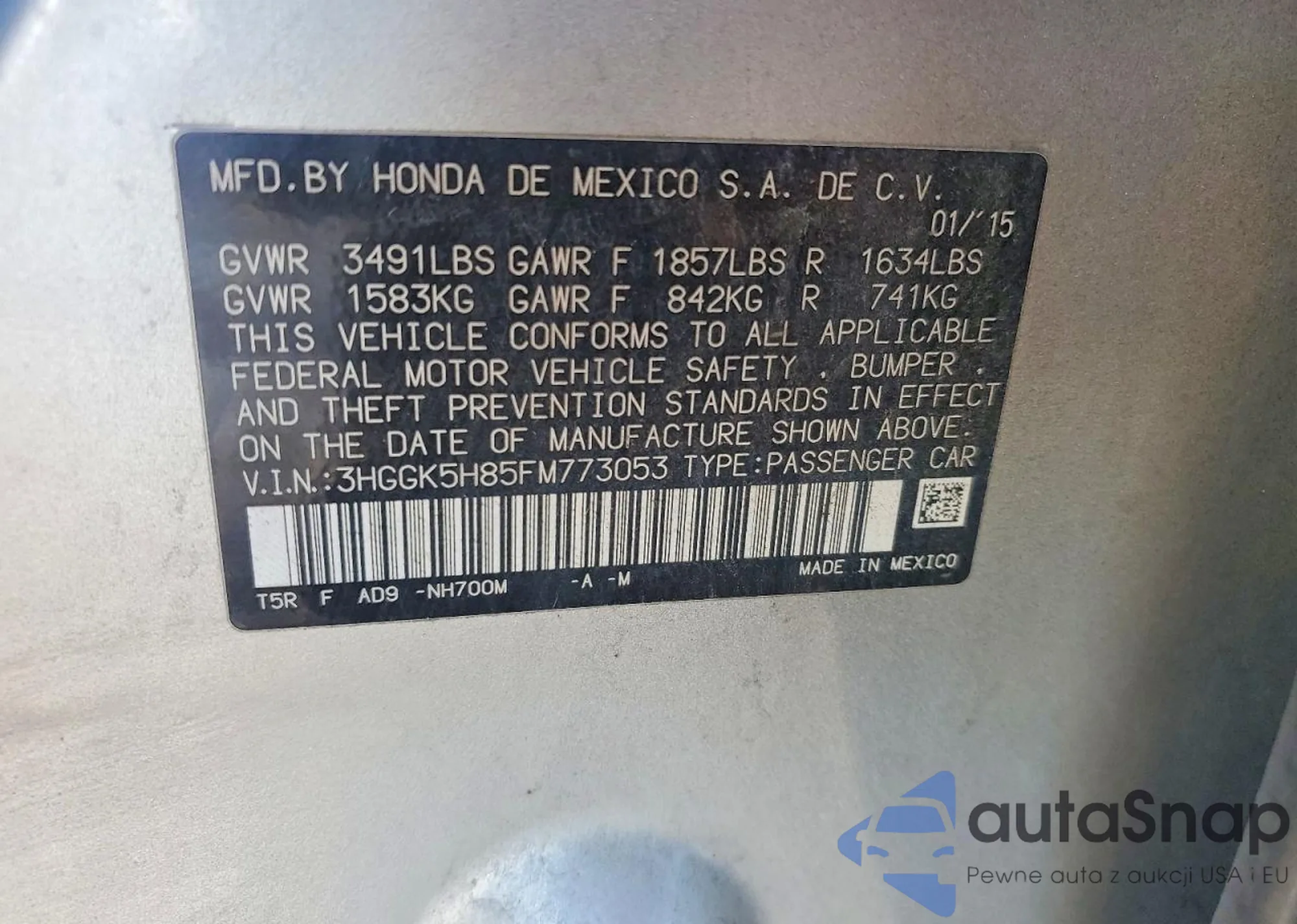 • VIN 3HGGK5H85FM773053
