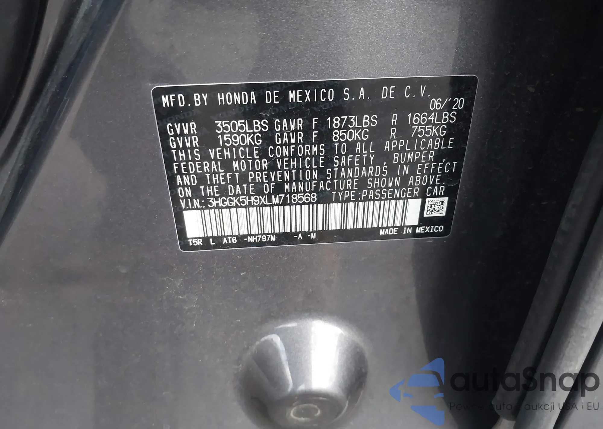 LOT: 44213442 VIN: 3HGGK5H9XLM718568